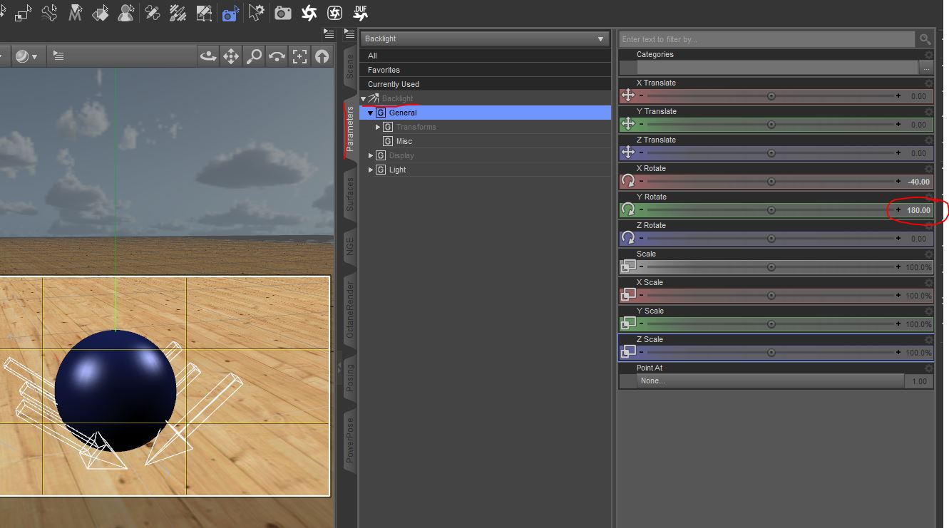 Nächster simpler Schritt, wir drehen das zweite Licht (DistantLight 2 / Backlight) um 180 Grad.