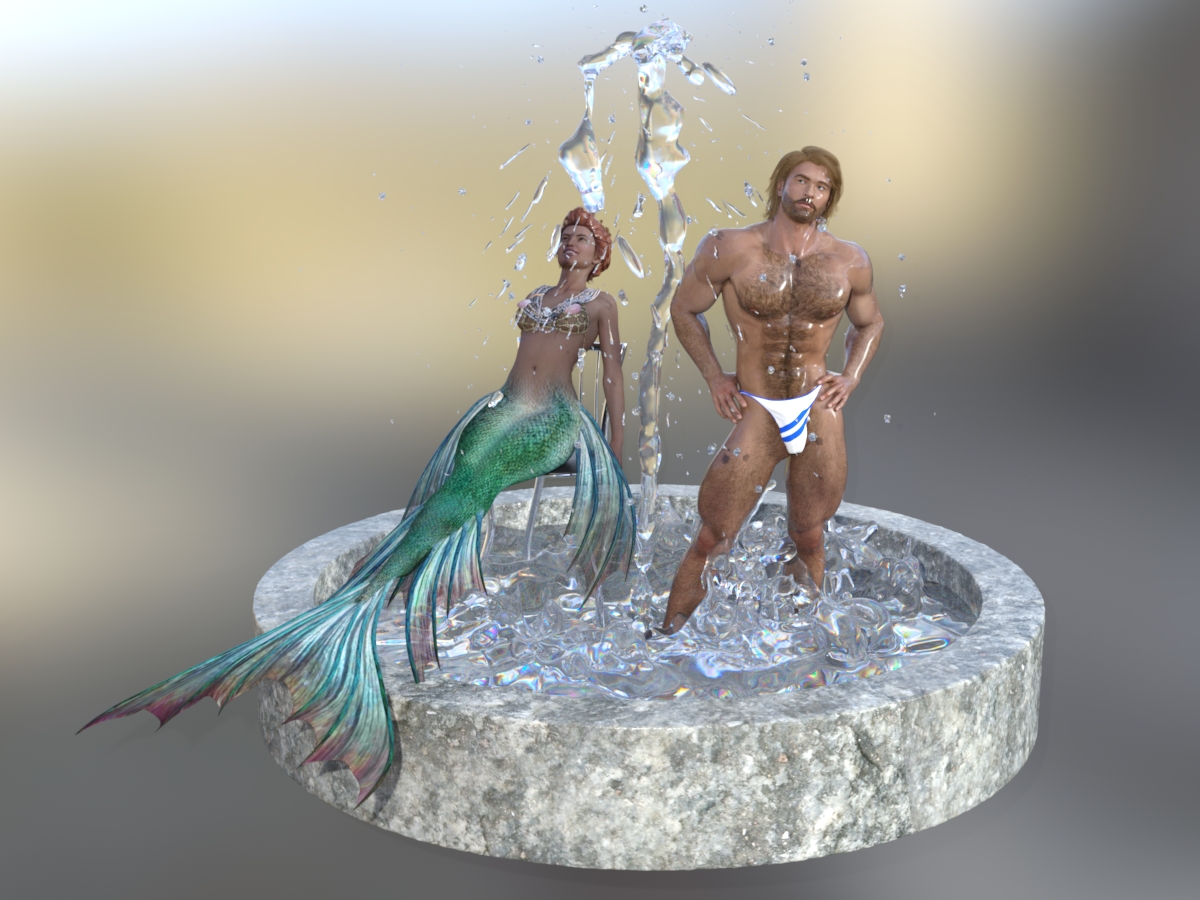 Hier sind V4 + M4 (mit Jepes Jonah-Skin) mit den Generation-4-Iray-Shadern und dem Rigged Water Iray.