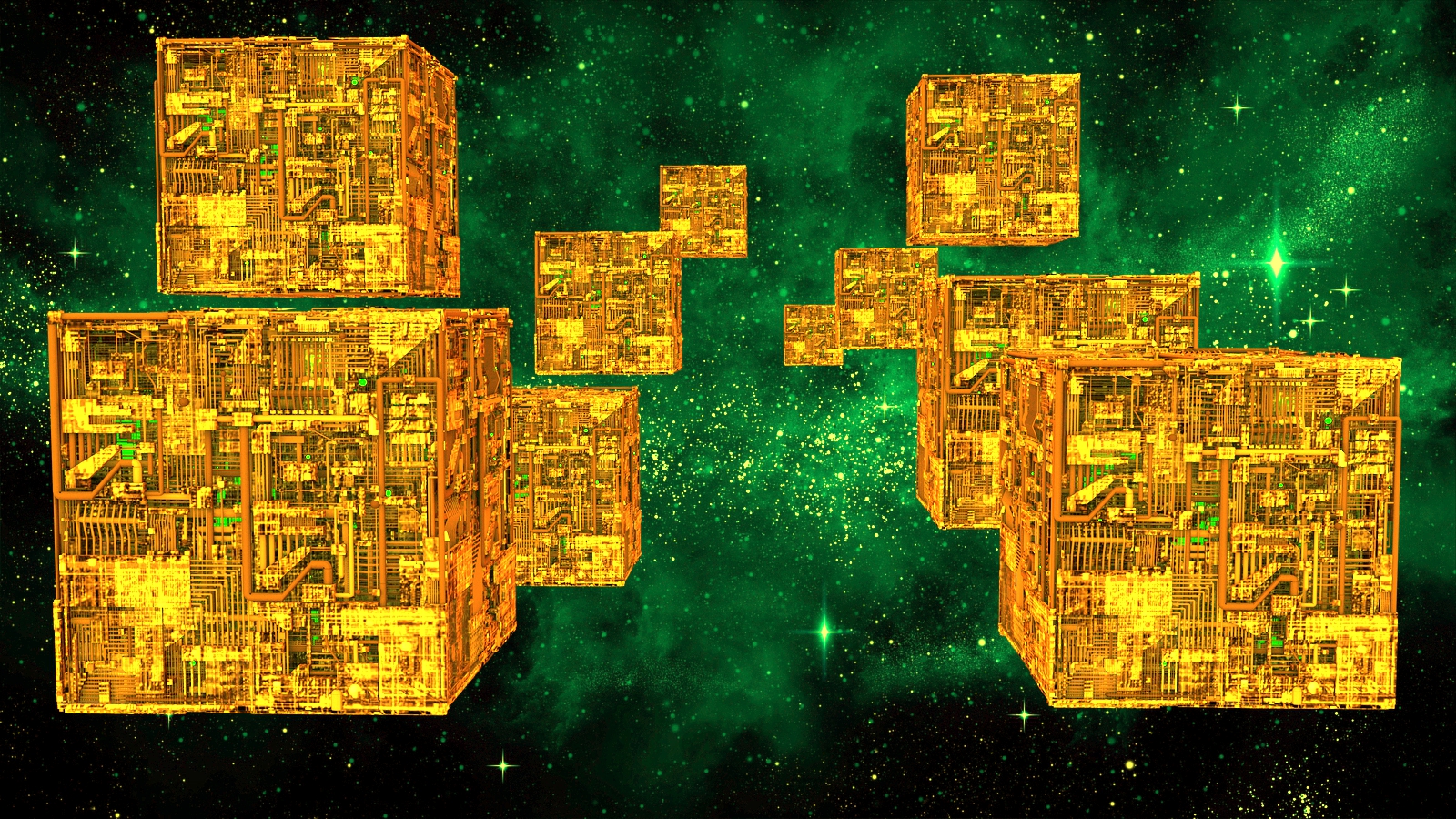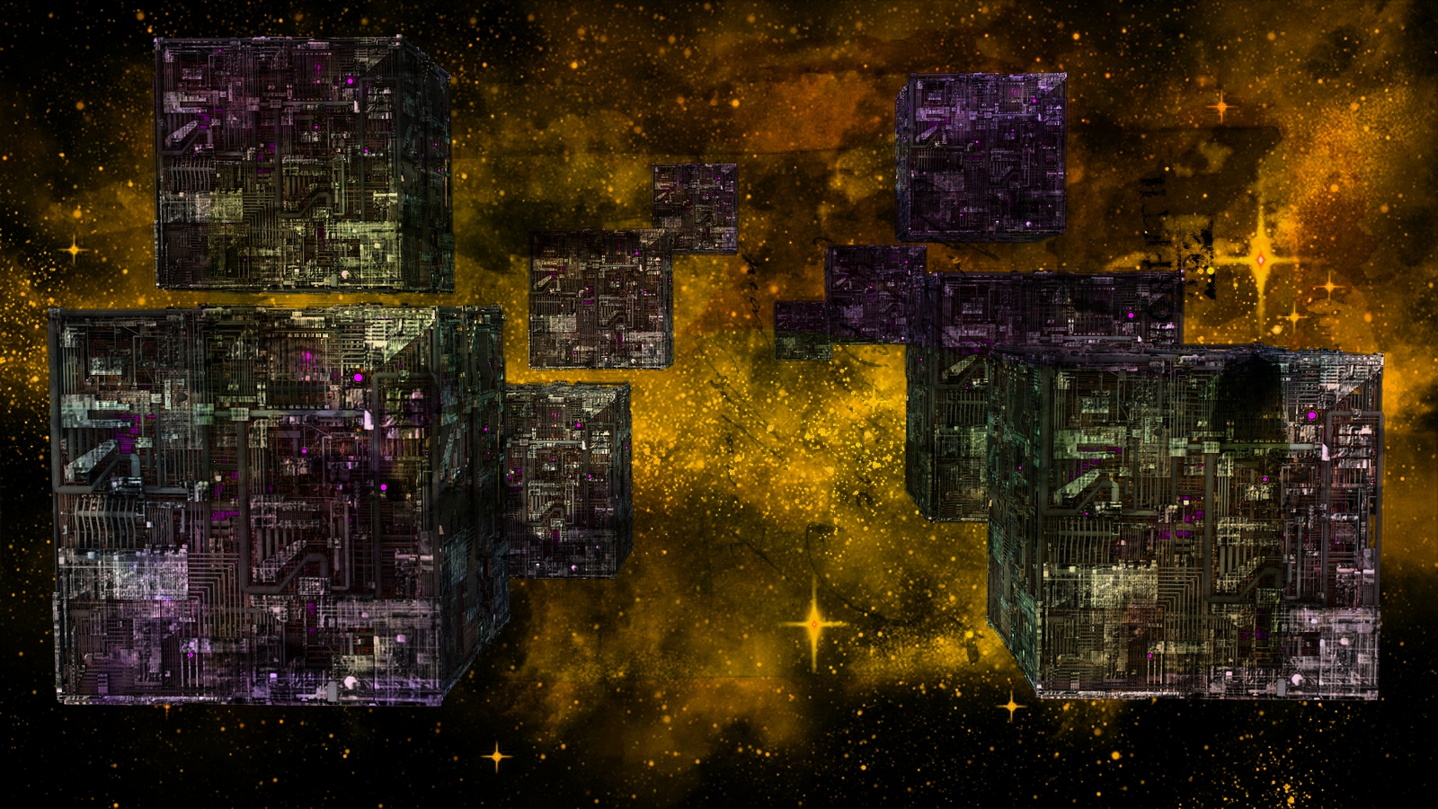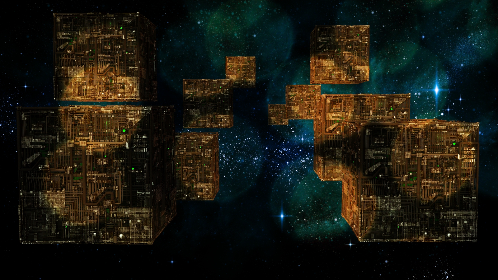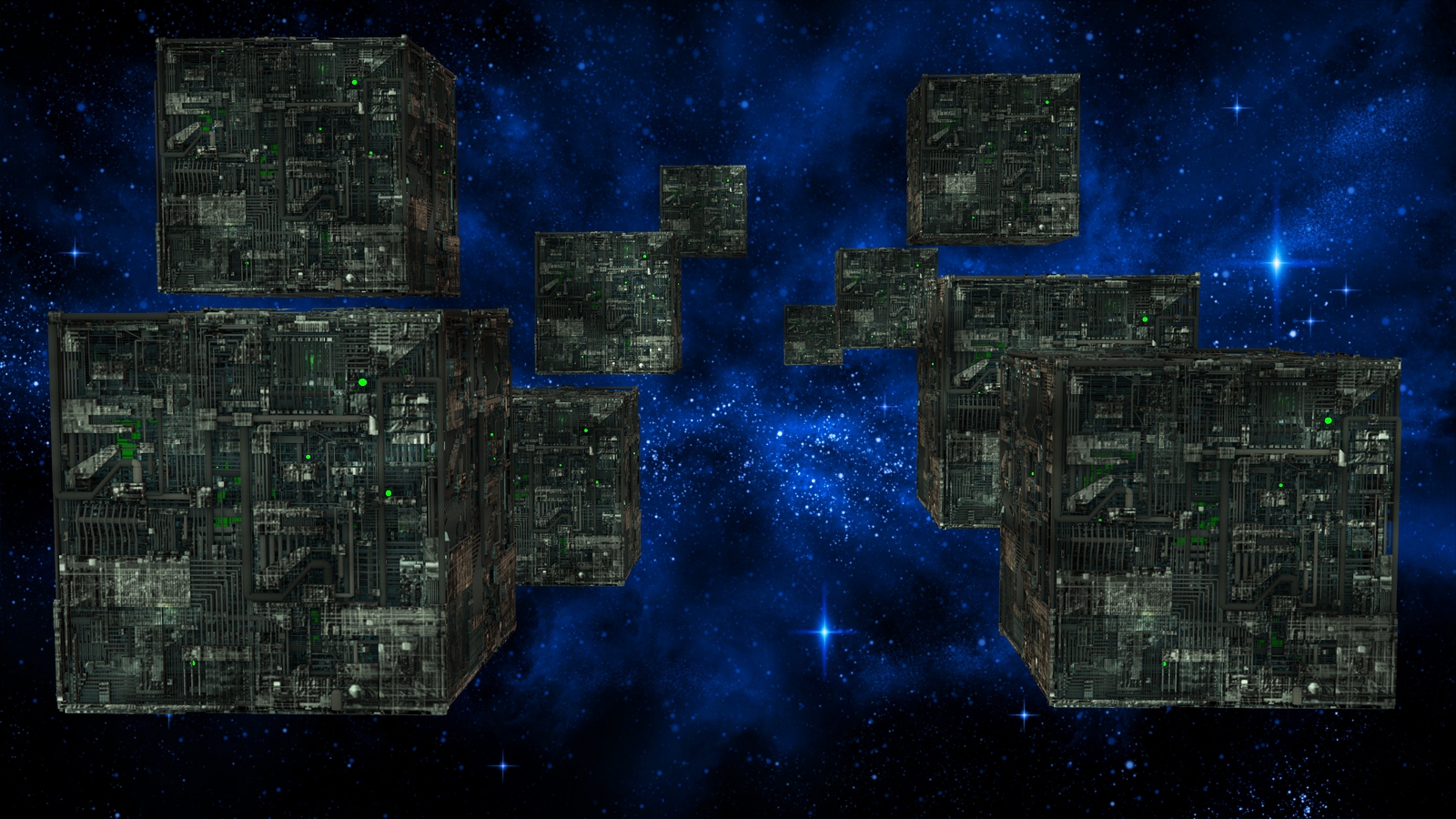 Wenn keine Menschen oder sonstige Figuren in der Szene enthalten sind und auch keine Landschaft, an Hand derer man eine Größenbestimmung festmachen würde, kann man doch gut faken. Einfach die Borgwürfel so klein skalieren, dass sie in den Einstell-Bereich der negativen Lichter hinein passen... im Weltall fällt das nicht auf.