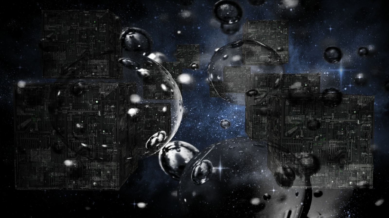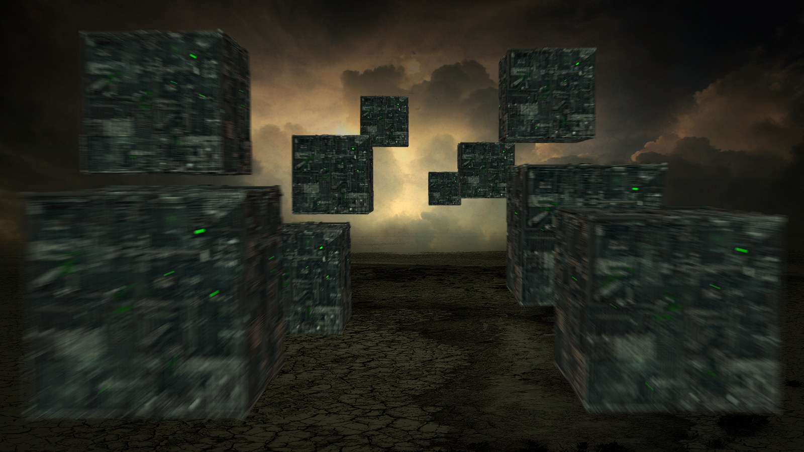 Die Borgwürfel mit transparentem Hintergrund rendern und die Hintergrundbilder mit einem Zoom-Filter (hat PS bestimmt auch) verzerren. Wie ich es mal mit meinen Taschenmessern gemacht habe. Dann alles zusammenbringen.Lg