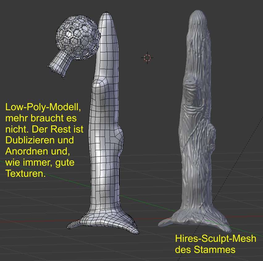 für den Fruchtkörper habe ich die Grundform zusammen geboolt, das als Grundlage für das Sculpting genommen, ein Retopo drüber gemacht, Texturen gebacken, Kelch und Stamm waren am Anfang Zylinder......