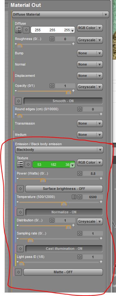 Dort findest Du weiter unten den Punkt Emission. Achso prüfe oben zuerst den Typ des Materials. Der sollte für sowas auf Diffuse stehen. Glossy Material kann als einziges keine Emmision bekommen. Dazu muss man das erst auf MixMaterial stellen.