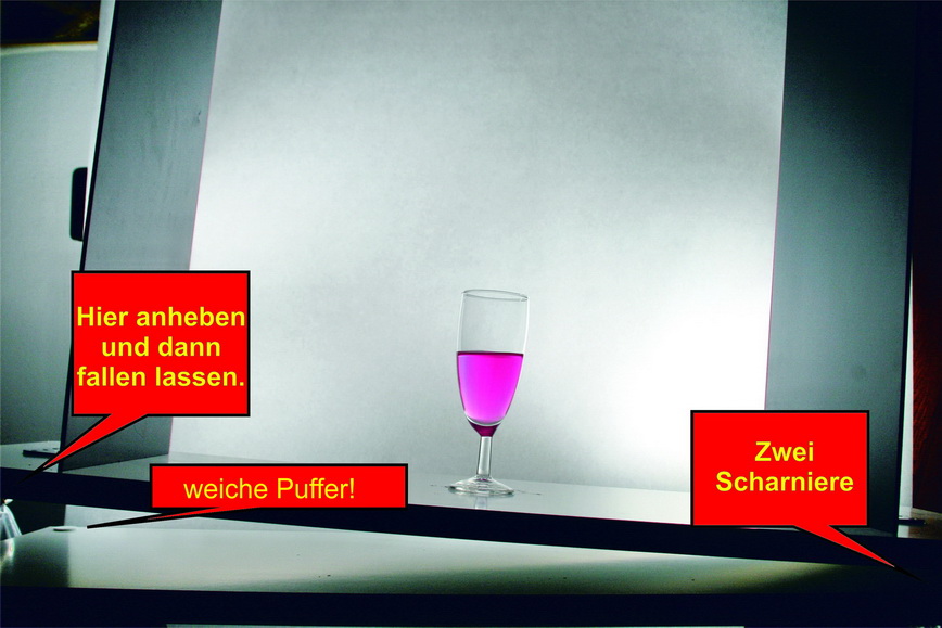 Hier das wesentliche Detail: die ZWEI Bretter, auf denen das Glas steht, werden an einer Seite mit Scharnieren verbunden.