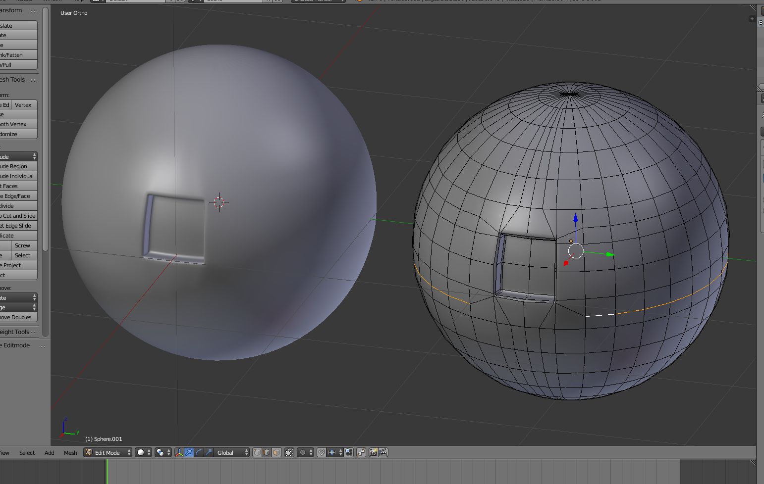 Eigentlich simple Aufgabe. Extrudiere (E) zwei Vertiefungen in eine Sphere und trenne die Vertiefungen als gesondertes [lexicon]Mesh[/lexicon] (P).