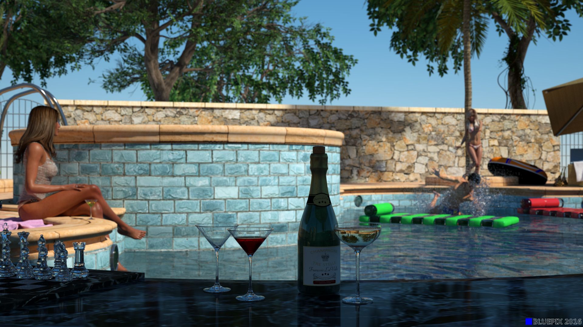 Die Bäume im Hintergrund finde ich cool. Sind aber keine richtigen 3D-Objekte, oder? Alpha-Plames? Erscheinen (zumindest hier bei mir und für mich) ziemlich 'matschig'. Die Wasseroberfläche des Pools wirkt - auf mich - auch eher wie bei einem Bach. (Und reflektive Caustics - zumindest an den Wänden - würden die Szene imho deutlich aufwerten.) Die Refraktion des rechten Glases kommt mir irgendwie total falsch vor ... so rein vom optischen Eindruck her.