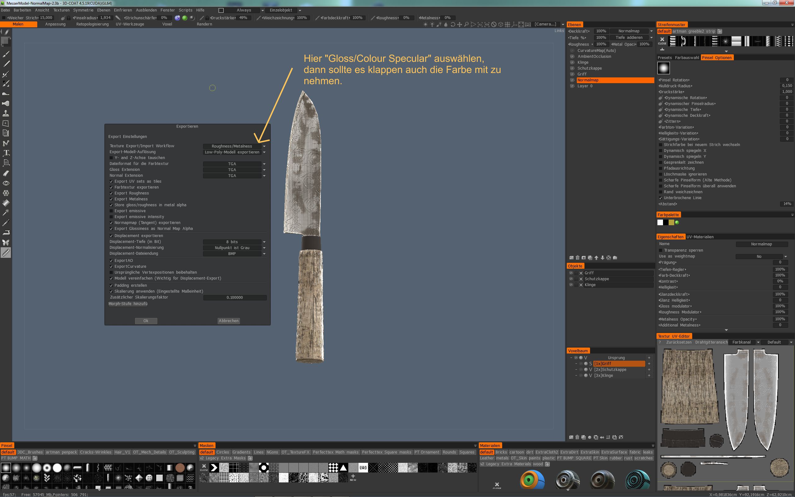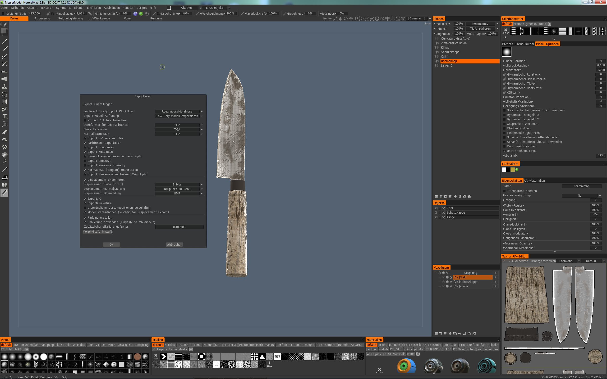 Um zu deinem Messer zurückzukommen: Du kannst die Geometrie als obj-Datei abspeichern, samt UVs und Materialzonen, z.B. für Klinge und Griff. Du kannst Texturmaps (2D-Bilddateien) erstellen, damit der Messergriff eine Holz- oder Ledertextur bekommt.