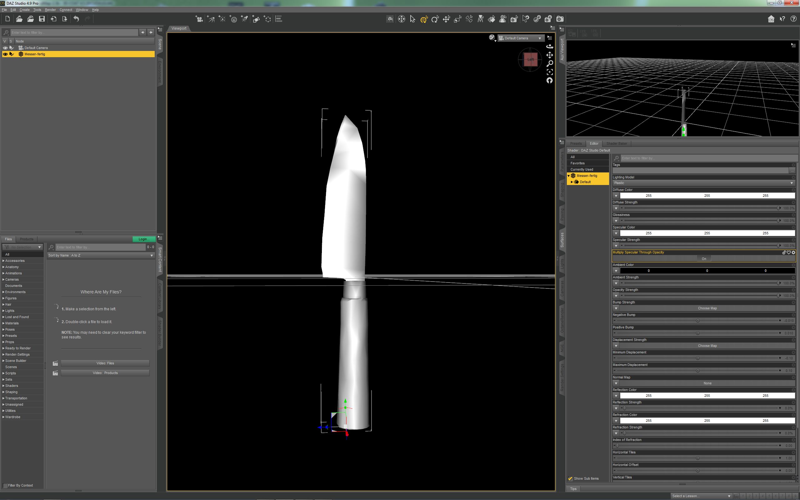 Wenn ich mein Messer als OBJ exportiere, dann habe ich nach Import in DAZ nur eine graue und grausliche messerartige Form.