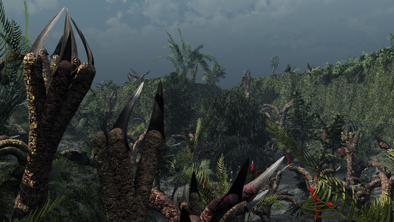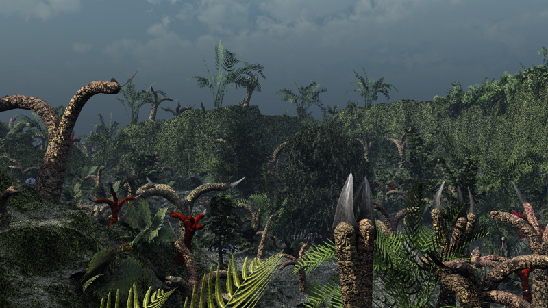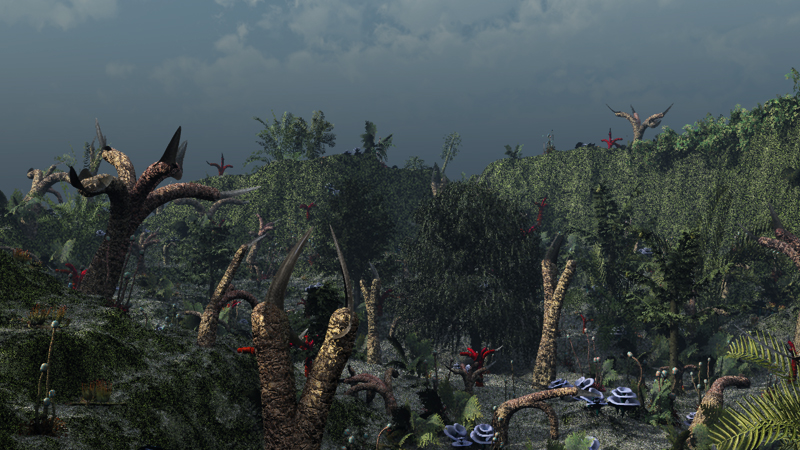 Die drei folgenden Bilder ergaben sich aus ein paar Mischungen mit der Ökosystemfunktion von Vue. Das Gelände und die X-Frog-Bäume sind immer dieselben, lediglich das Gestrüpp drumherum habe ich variiert. Die beiden ersten Bilder sind mit Dichten um 90% bepflanzt, aber unter Vermeidung von Überschneidungen der einzelnen Instanzen / Komponenten. Die dritte Szene habe ich mit 65% Dichte bepflanzt, aber gleichzeitig auch Überschneidungen freigegeben, um einen dichteren Bewuchs zu erzeugen.