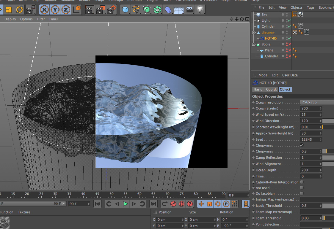 Die obere Ebene des Wassers selektieren und mit einer passenden Textur im Displacementchannel belegen.