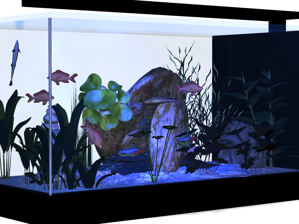 Zum Aquarium selbst: ich mag die Fische, sie sehen ziemlich natürlich aus in ihren Posen. Wenn du noch weiter dran rumschrauben möchtest, könntest du das Wasser mit einer Refraction belegen. Dazu muss es aber ein Würfel im Aquarium sein. Geh dazu folgendermaßen vor: