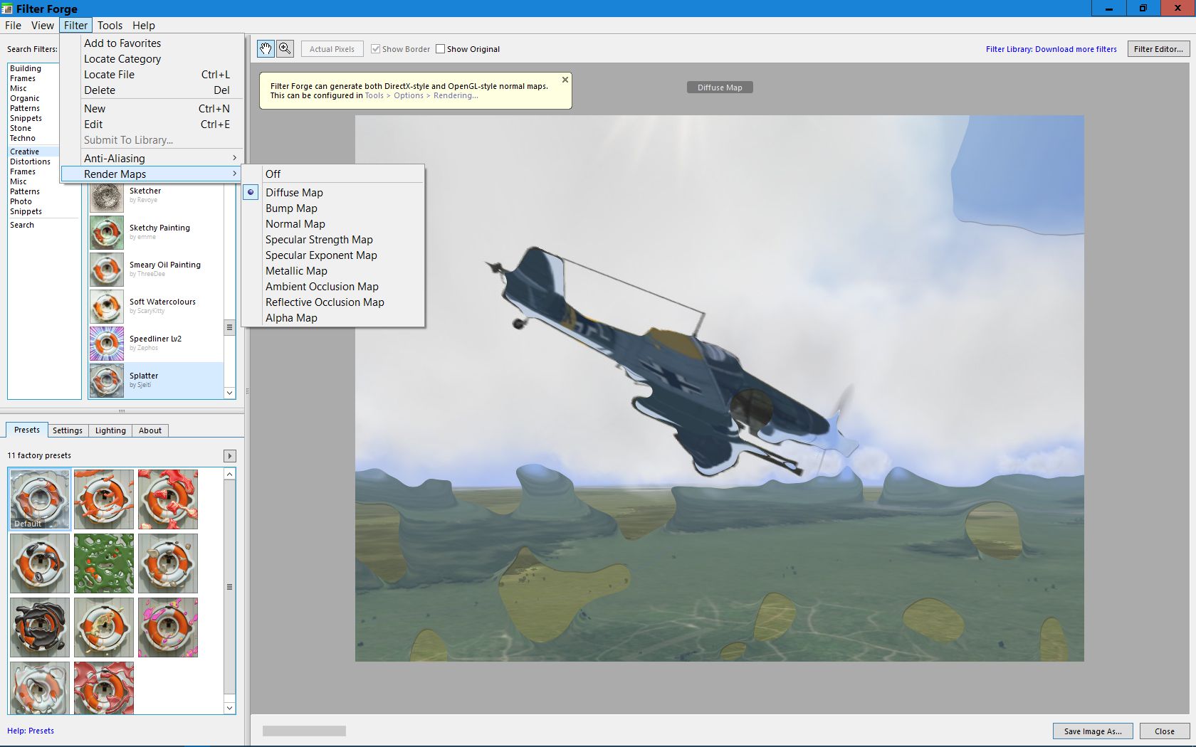 das Rendern der einzelnen Maps ist nur mit den bei Filter Forge erhältlichen Surface Filtern möglich.