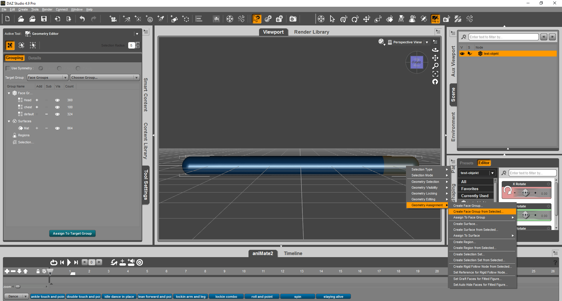 3. Geomotrie die Teile Default in head, chest und end aufgeteilt, dazu den jeweiligen Bereich markiert (Selections Typ Crtl+[) und Selections Mode Marquee, als nächstes wieder rechte Mousetaste auf das Markierte Teil und Geometry Assignment>Create Face Group from Selected und Namen vergeben