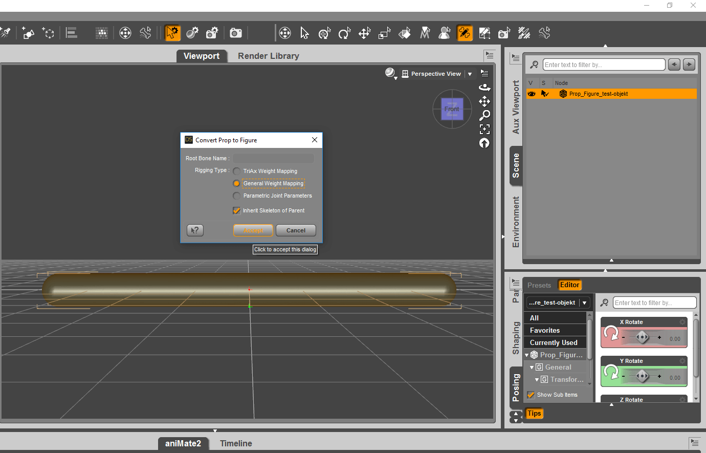 4.rechte Mousetaste auf das Prob, Y> Edit > Convert Prop to Figur , es folgen Bild 5 und 6. Nach Bild 6 wurde ein kleiner Bones in der Mitte erstellt