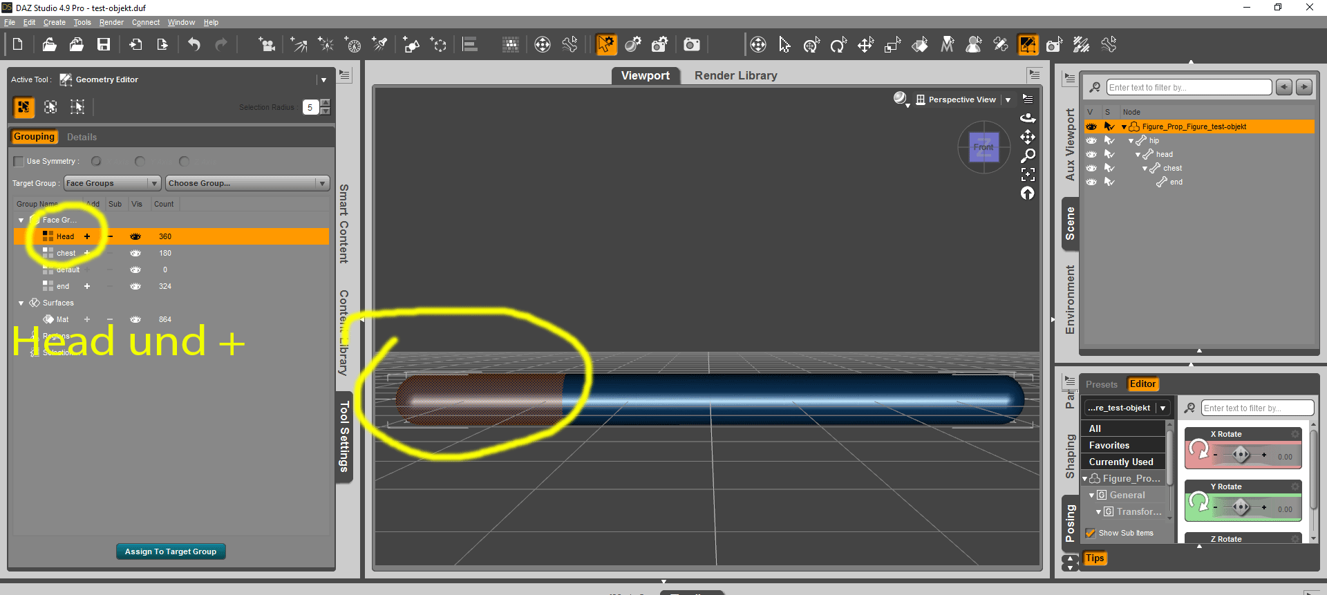 • 12. eine Face Group aus wählen, hier im Bild 12 gewählt, Head und danach auf das + (Plus) geklickt, wodurch das Model erleuchtet