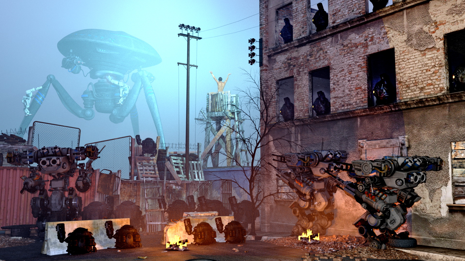 Volle Packung: 24 Robbies und ein "Mensch" + volum. Nebel und diverse Lichter in den Ruinen des "The Last Stand" (Daz Originals + DzFire).