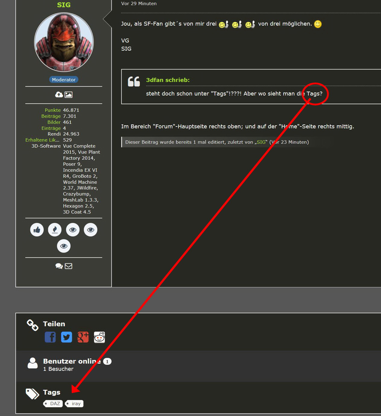 Verwendete(s) Programm(e): steht doch schon unter "Tags"!???! Aber wo sieht man die Tags? Also: mit DAZ und Iray gemacht.