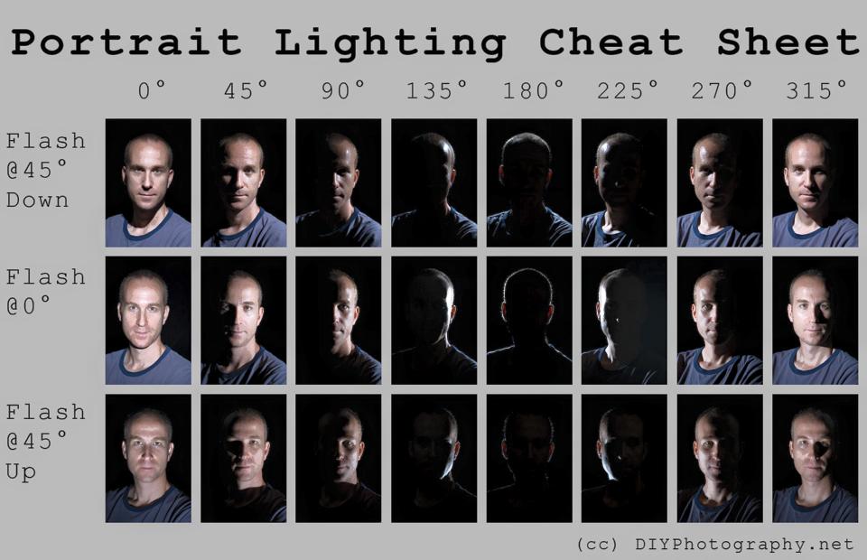 The top line of head shots has the light pointing down at 45 degrees about two feet above the subject which is the most common and useful. The bottom line has the light pointing upwards at 45 degrees.