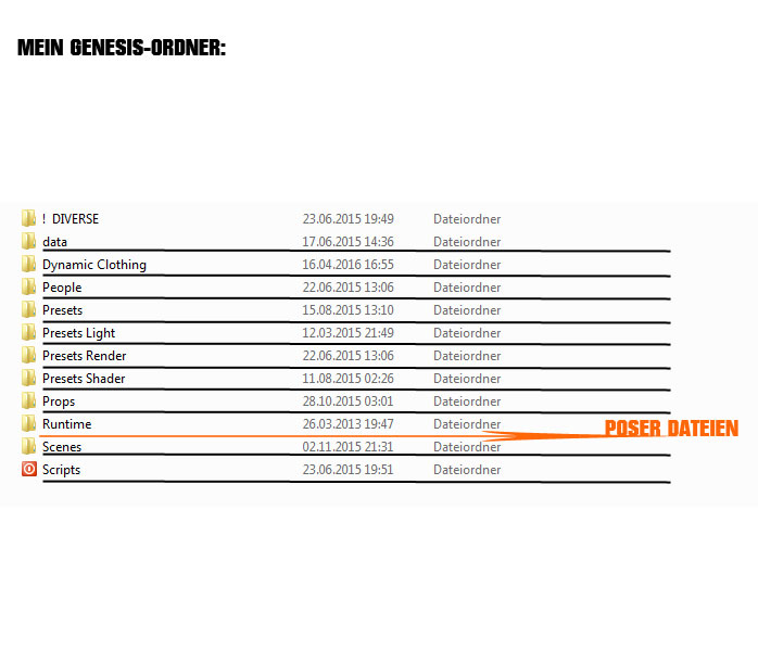 Ich habe einen Überordner dieser heißt "GENESIS" darin befinden sich alle Dateien für Poser und DAZ Studio. Damit Du Dir das besser vorstellen kannst, hab ich Dir einen Screen von meinem GENESIS Ordner angehängt, damit Du die Ordner Struktur mit Deiner vergleichen kannst. Alles schwarz unterstrichene sind DAZ Dateien - der rote Ordner (Runtime) gehört zu Poser. (DIVERSE und Dynamic Clothing darfst ignorieren - das sind persönliche Ordner von mir)