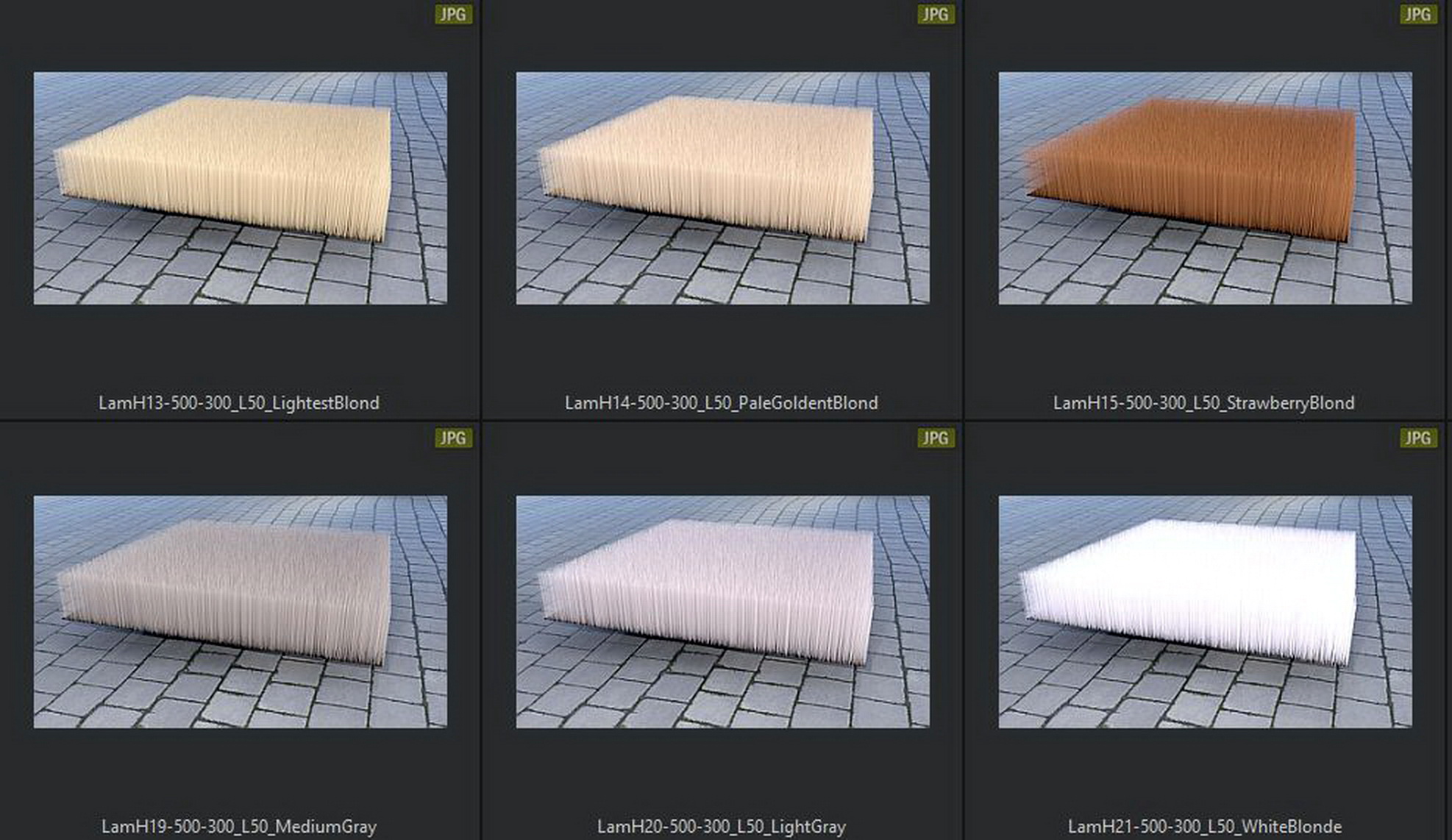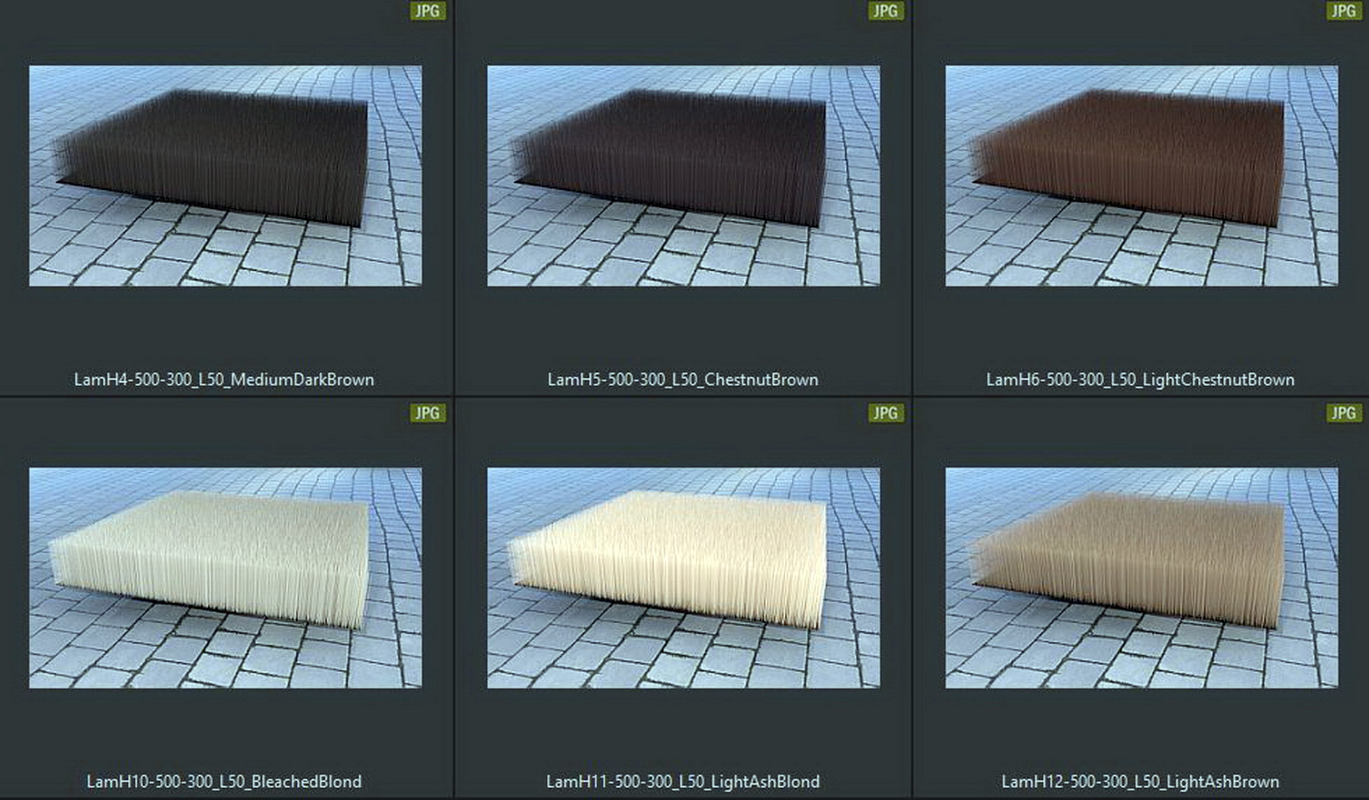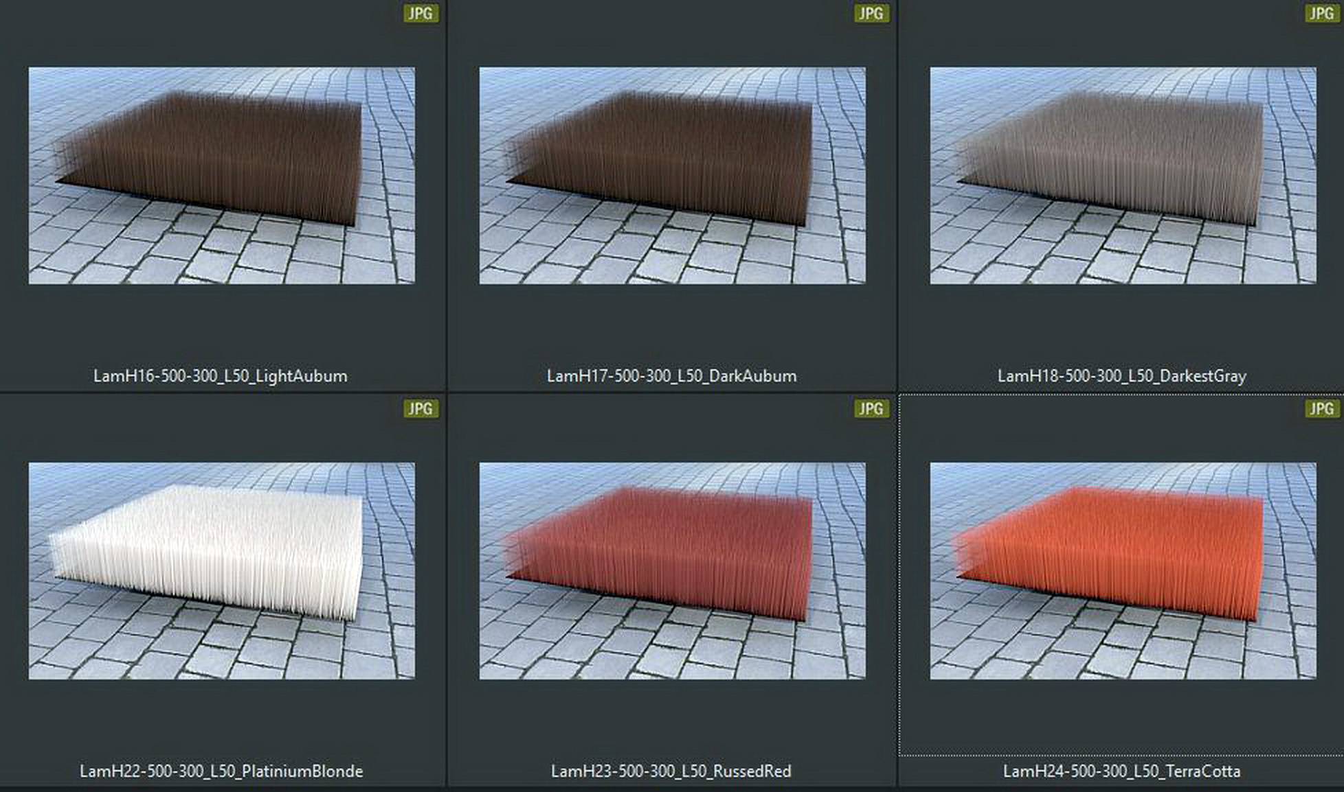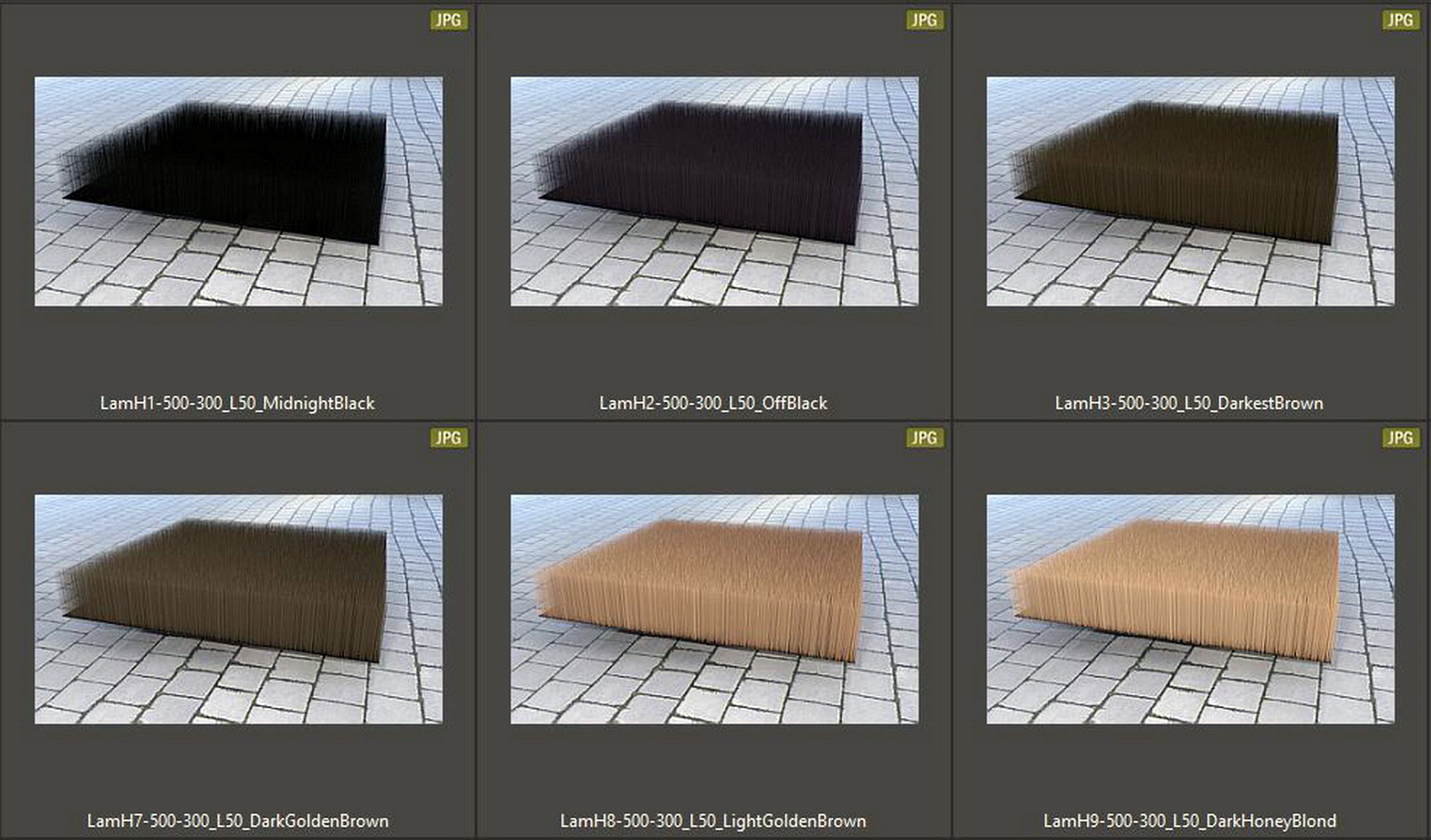Hier die Farbtafeln (jeweils mit 100 00 Haaren gerendert).