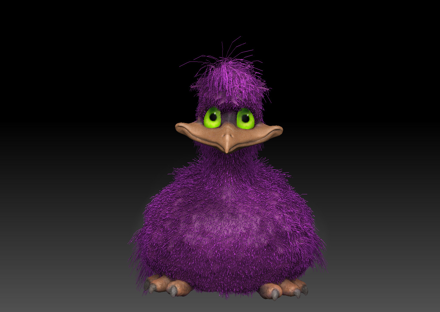 Ich habe mir das fertige Huhn in Z Brush geladen, (natürlich in Einzelteilen, ich bin ja nicht mehr ganz so doof wie noch vor 3 Tagen) dann habe ich unter Fibermesh ein wuscheliges Haarkleid ausgesucht und auf Vorschau geklickt. Daraufhin sah das arme Huhn aus Wie ein explodierter grüner Heuhaufen. Also angefangen zu maskieren, schön ordentlich, Schnabel und Füsse, und das Ganze nochmal von vorne. Nun hatte das arme Tier die Wolle plötzlich auf Schnabel und Füssen. (Ist ja auch naheliegend, dass man die Teile maskiert, die mann bearbeiten will??)