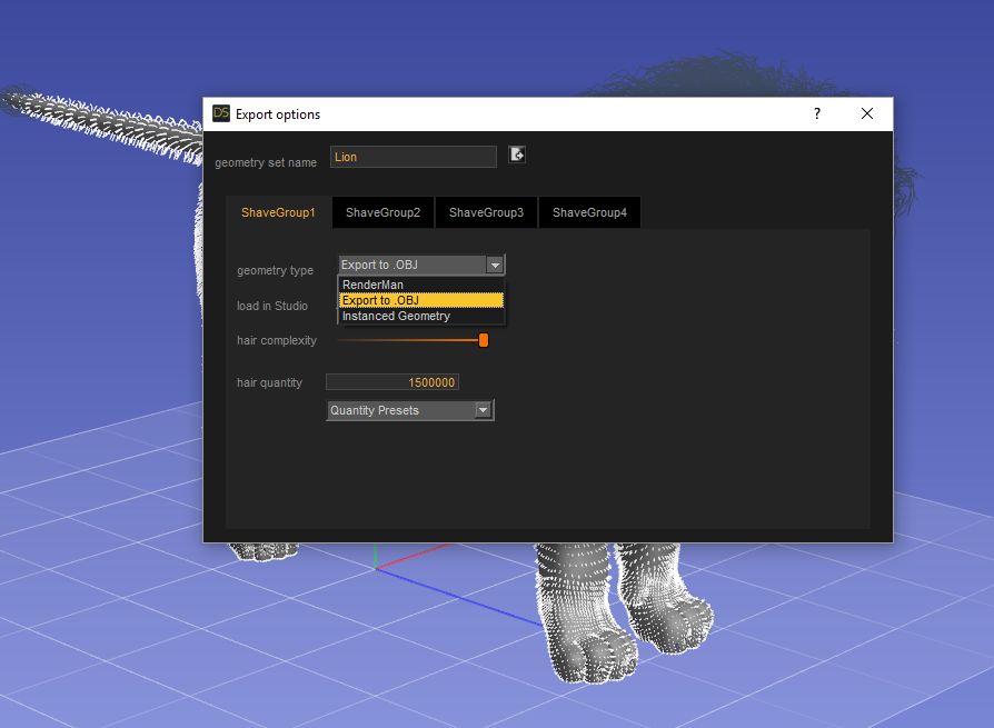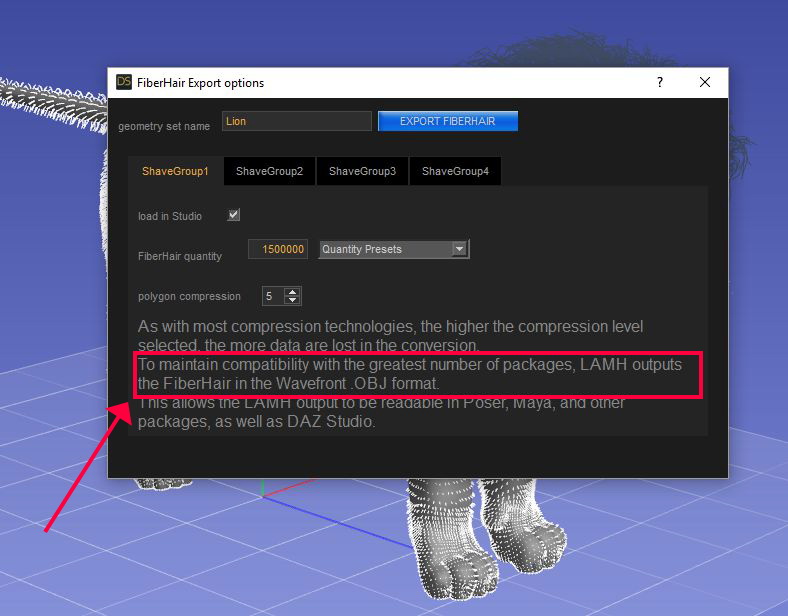 Klicke ich alternativ den Button "Fiberhair" an, dann geht zwar ein anderes Export-Fenster auf, aber auch dort steht, dass der Export über "OBJ." geht:
