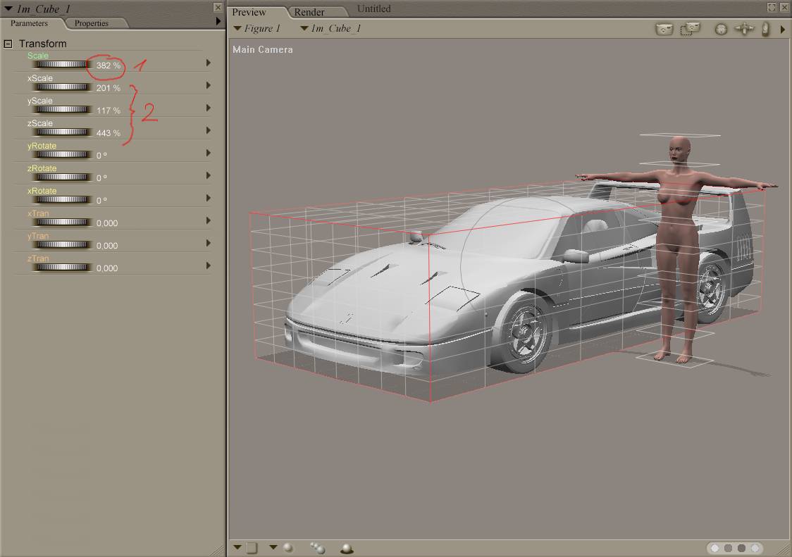 Damit kann man ganz gut skalieren: eine 1,62m hohe Figur? Einfach den Würfel auf 162% Y - skalieren und die Figur einpassen. Ein korrekt dimensioniertes Auto? Maße aus dem Internet holen und die x, y, und z Skalierung des Würfels entsprechend einstellen. Auto in den Würfel einpassen, und gut is.