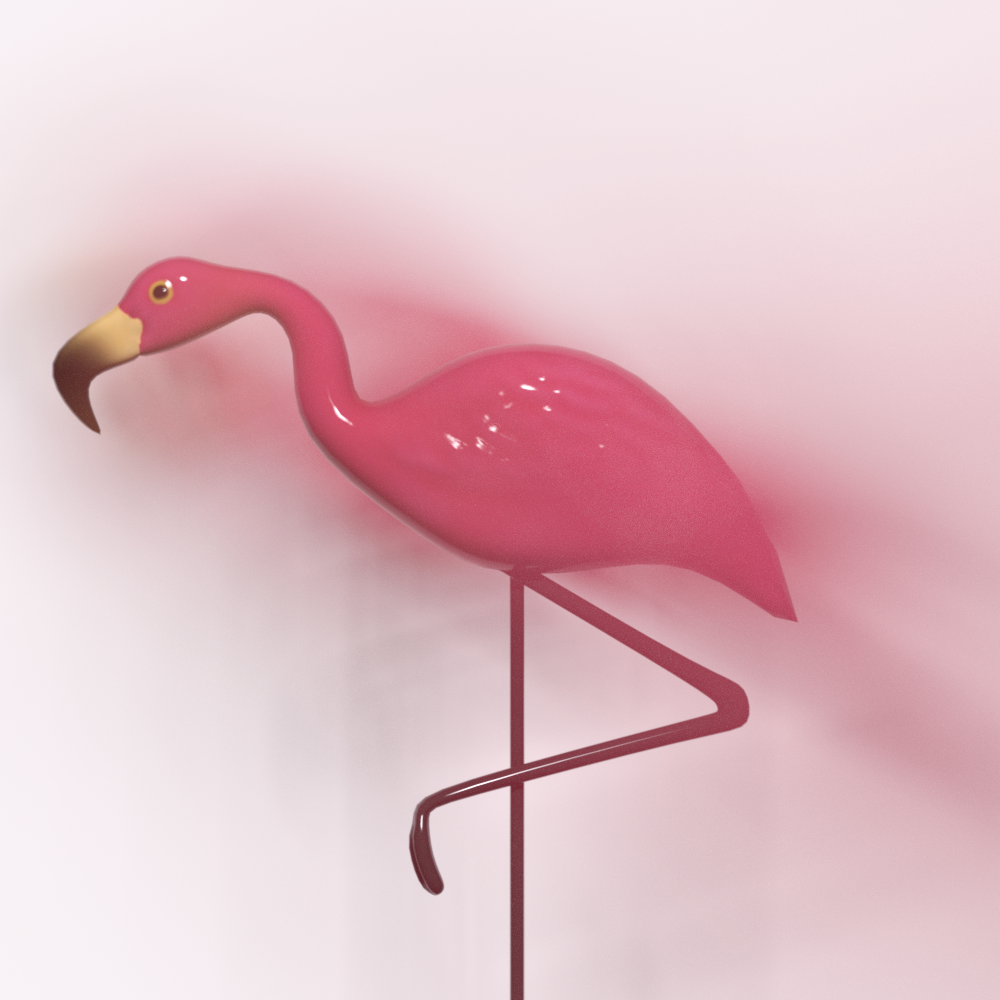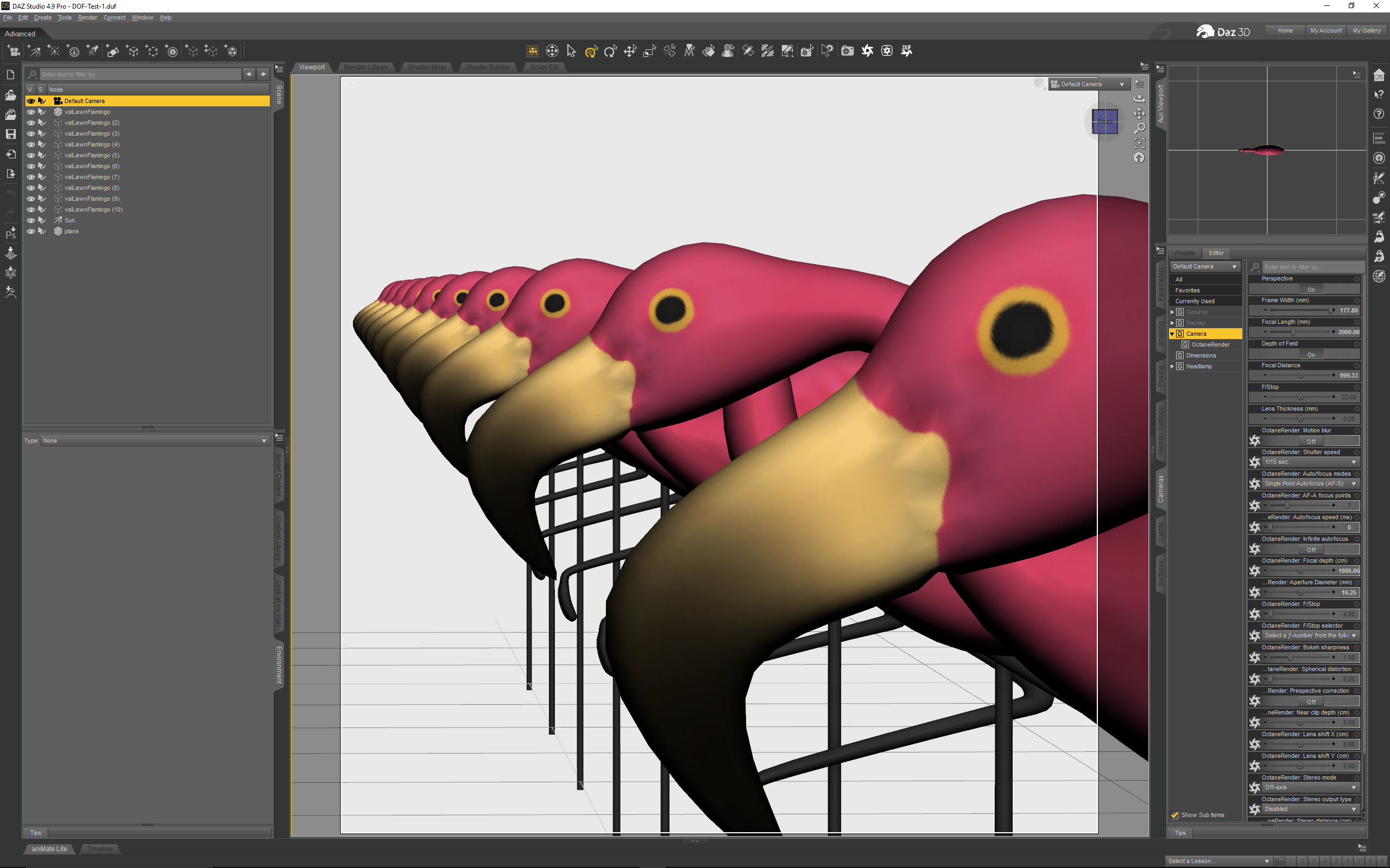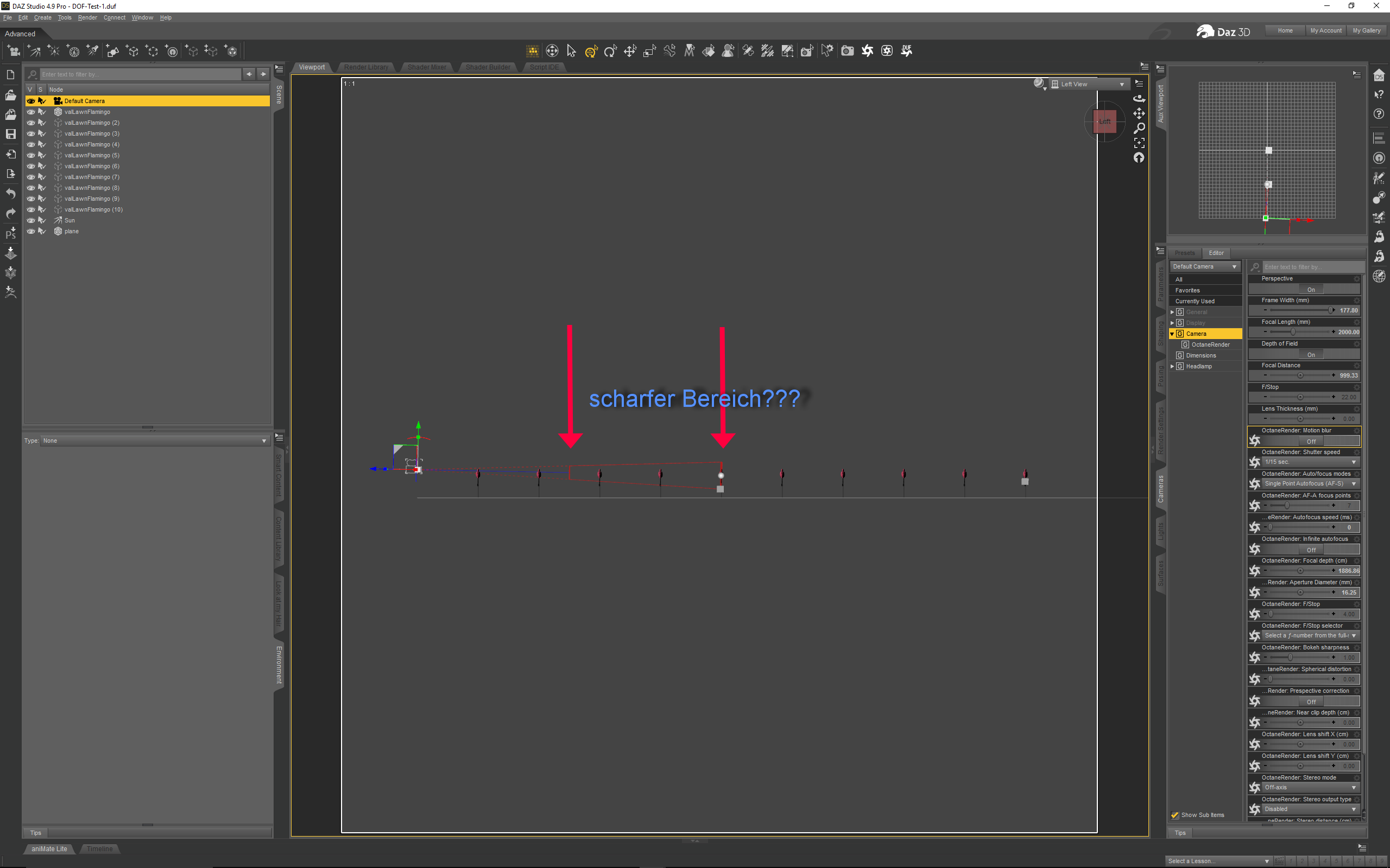 Ich habe 10 Flamingos mit Abstand 2 m hintereinander gestellt, um verschieden DOF-Bereiche zu testen.