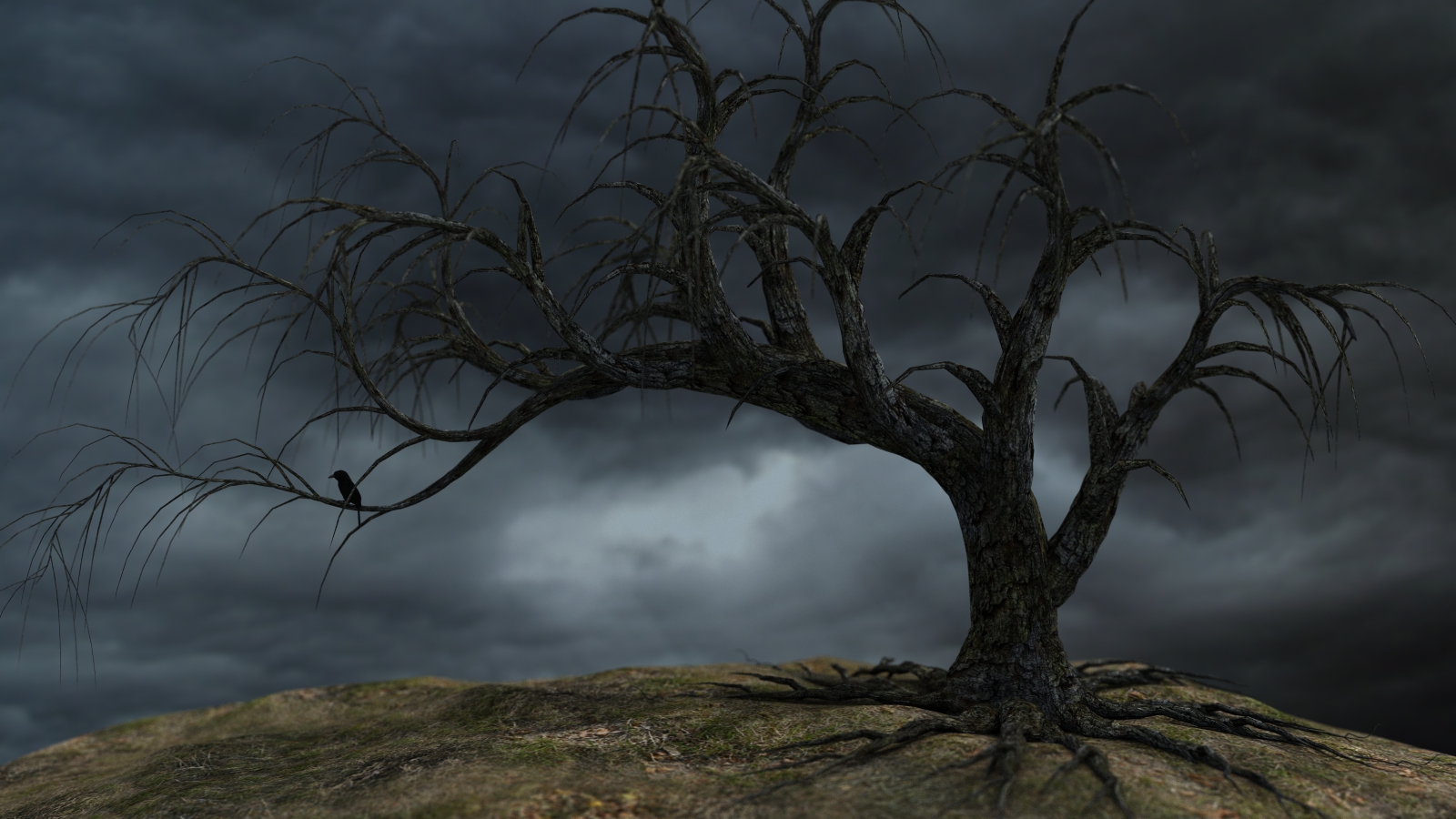 Und ich würde durch die Hintergrundgestaltung noch ein bisschen mehr Background-Story einfügen. Steht dieser Baum in einer weiten, leeren Ebene? Oder auf dem höchsten Hügel in einer Landschaft? Durch das Einfügen von entsprechenden Hintergrundbildern (das würde ich in Photoshop machen) kannst du mehr Kontext ins Bild bringen, damit der Baum und das bisschen Boden nicht so verloren dastehen. -