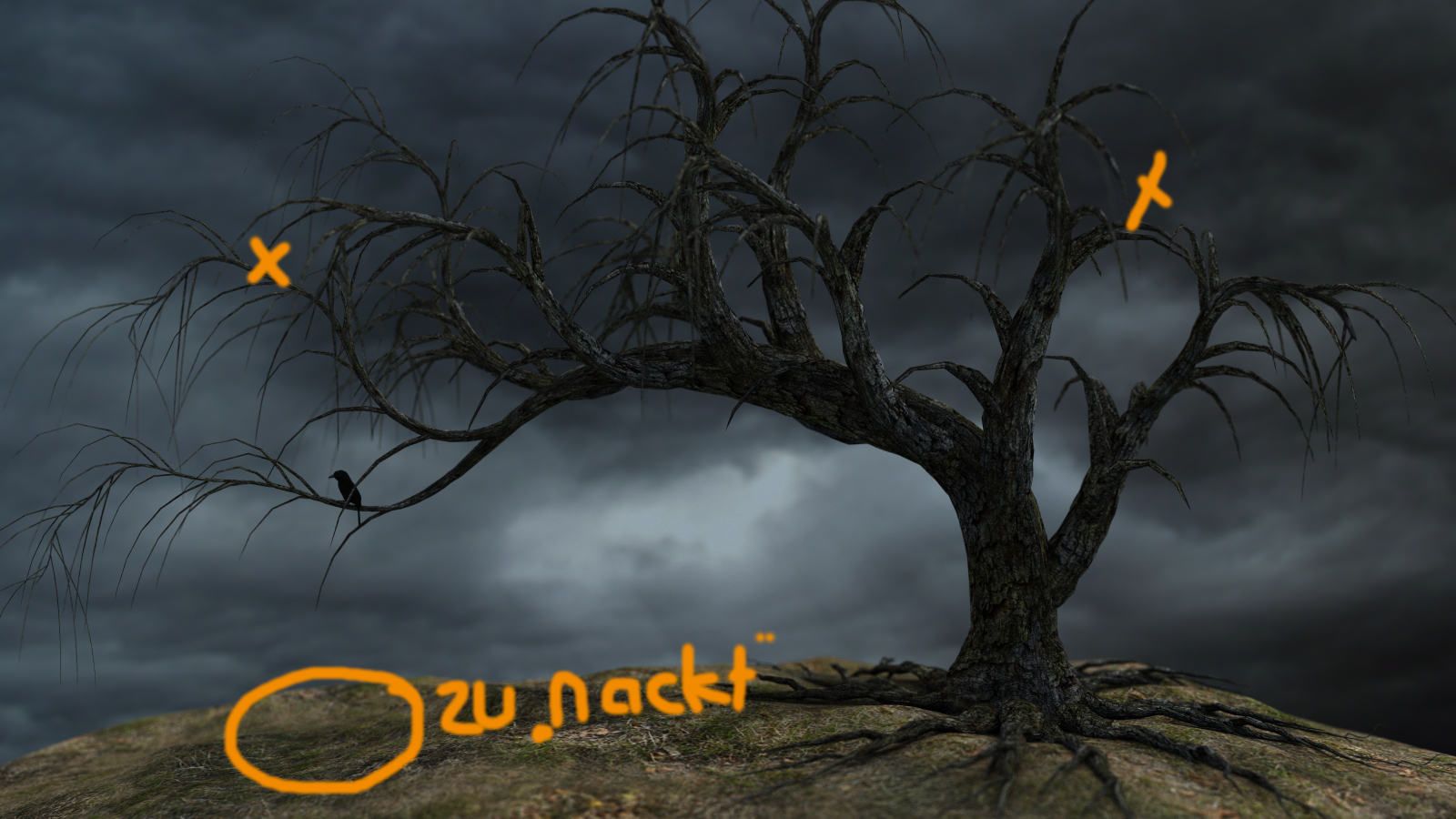 Ich glaube, der Baum vom 1. Bild gefällt mir am besten. Allerdings würde ich den Raben, auch unter der Gefahr, dass er teilweise etwas verdeckt wird, woanders hinsetzen - ich hab mal markiert, wo vielleicht. Dazu scheint der Boden unter dem Raben zu "nackt", insbesondere, wenn du ihn auf das entfernte Ende des Baumes setzt (rechtes X), sollte als Ausgleich hier etwas hin, denke ich. Was, das musst du entscheiden, das würde ich daran festmachen, was in dem Bild passieren soll.