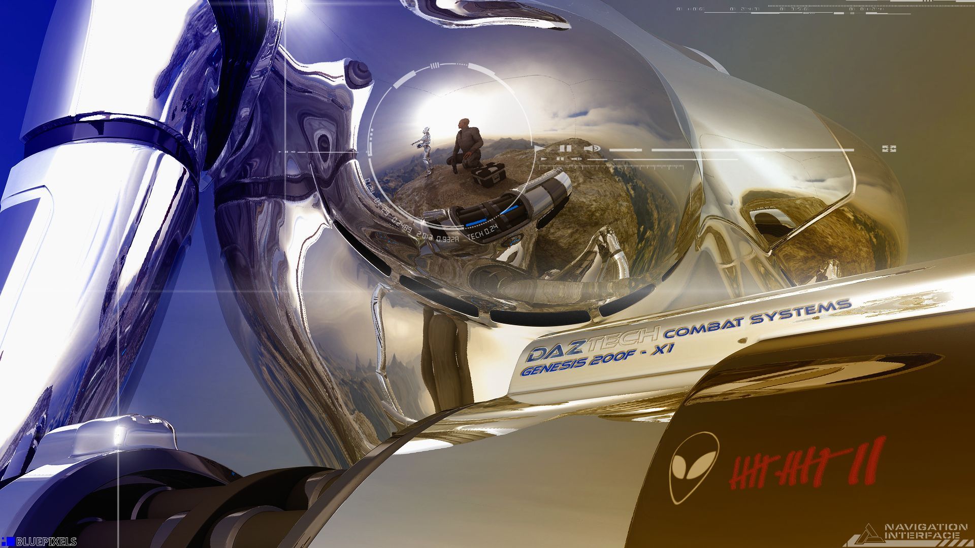 In diesem Fall einer aus meiner 3D Anfangszeit vor 3 Jahren. Nun ja, bunt isser jetzt. Und speziell die HUD Layer aus Ron's Bastelstube lenken den Blick des Betrachters nun mehr zum Besonderen an dem Render,