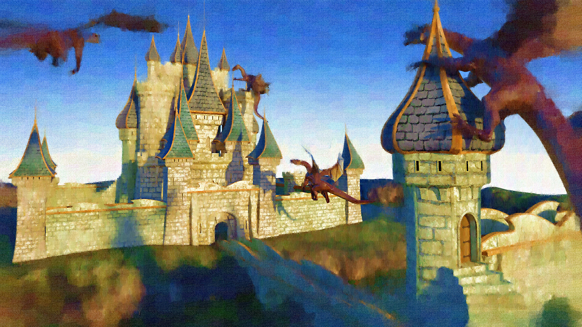 Beim "Mittelalter" kommt der eher flache, reliefartige Charakter der Burg sehr gut rüber, so hat man damals gemalt...