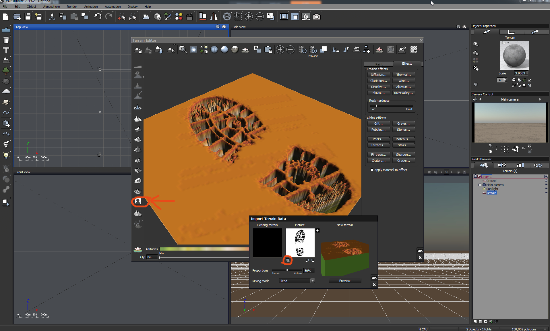 4.) In dem Dialogfeld Import terrain data mit dem Knopf unten links unter dem rechten Quadrat ein Graustufen- oder Schwarzweissbild aussuchen und laden - in meinem Fall war es ein Fussabdruck. Man kann nun mit dem Umschaltknopf oben rechts and dem Picturefeld die geladene Bilddatei auch ins Negativ verwandeln was ein völlig anderer Effekt ist. Die Höhe des so entstandenen Terrain lässt sich mit dem Schieber unter den Quadraten regeln und mit einm klick auf Preview sieht man auch, wie das Terrain aussehen wird. Ok klicken wenn man zufrieden ist.