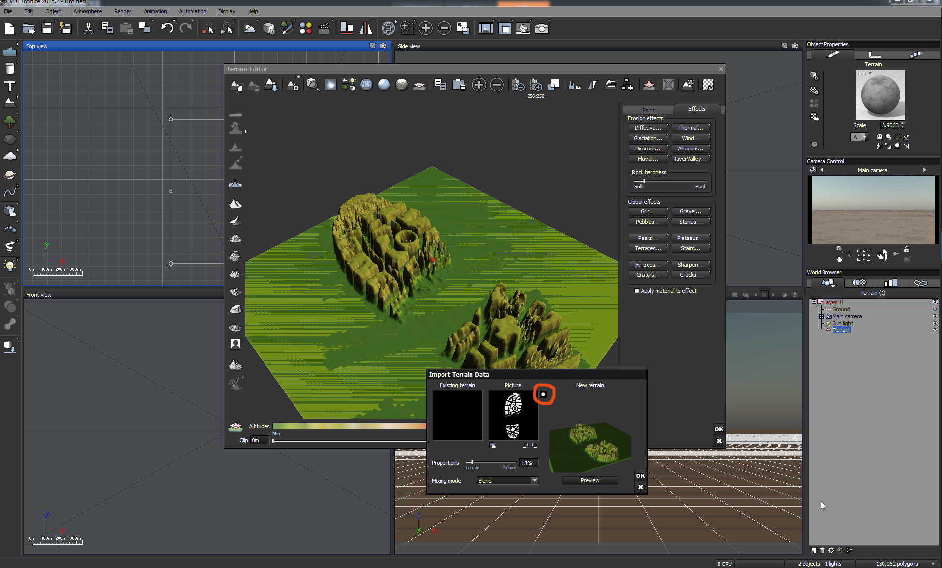 6.) Beispiele dafür wie dieses Terrain auf dem Boden oder senkrecht gestellt aussieht - man kann nu beliebig damit spielen und die Materialien und Kameraeinstellung verändern.