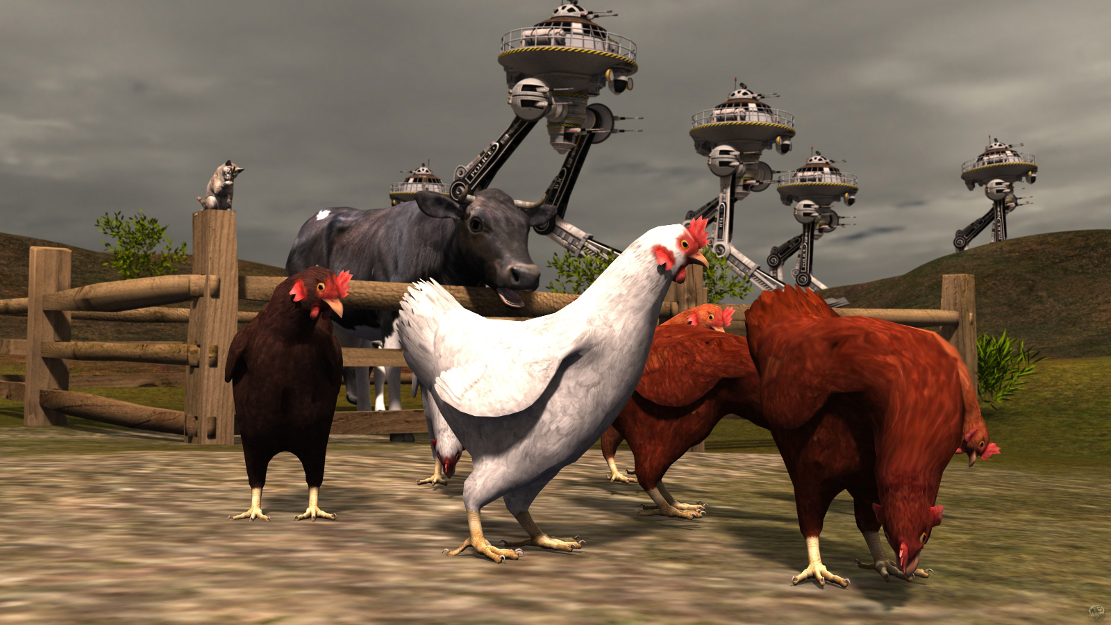 Licht wird natuerlich auch genutzt um das Auge des Betrachters zu führen. Wenn ich die Bild anschauen wandert mein Auge hin und her, vom Päärchen zu der Kuh , zu den Mechs und zu den Huehner.
