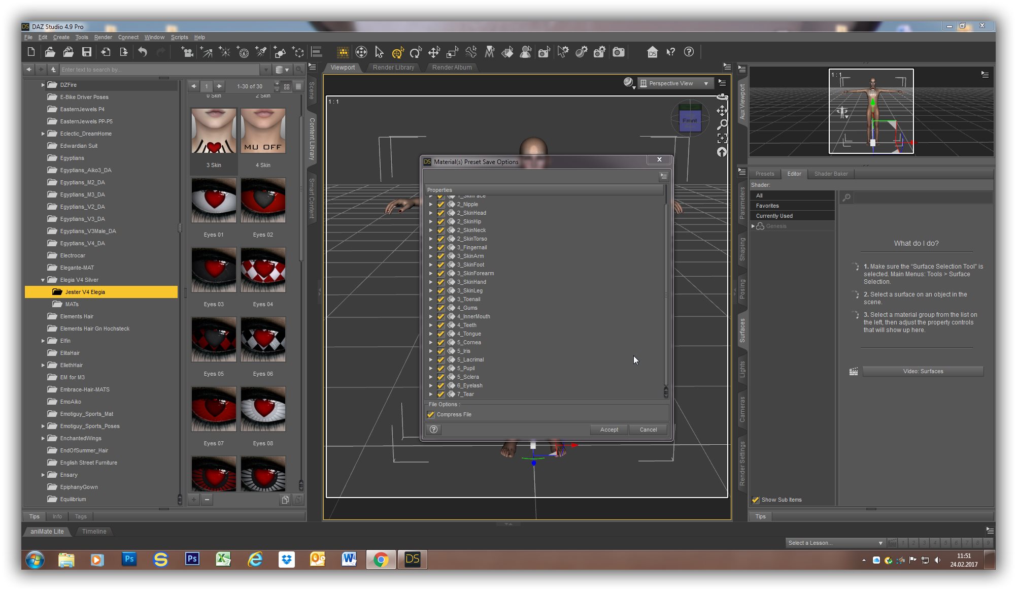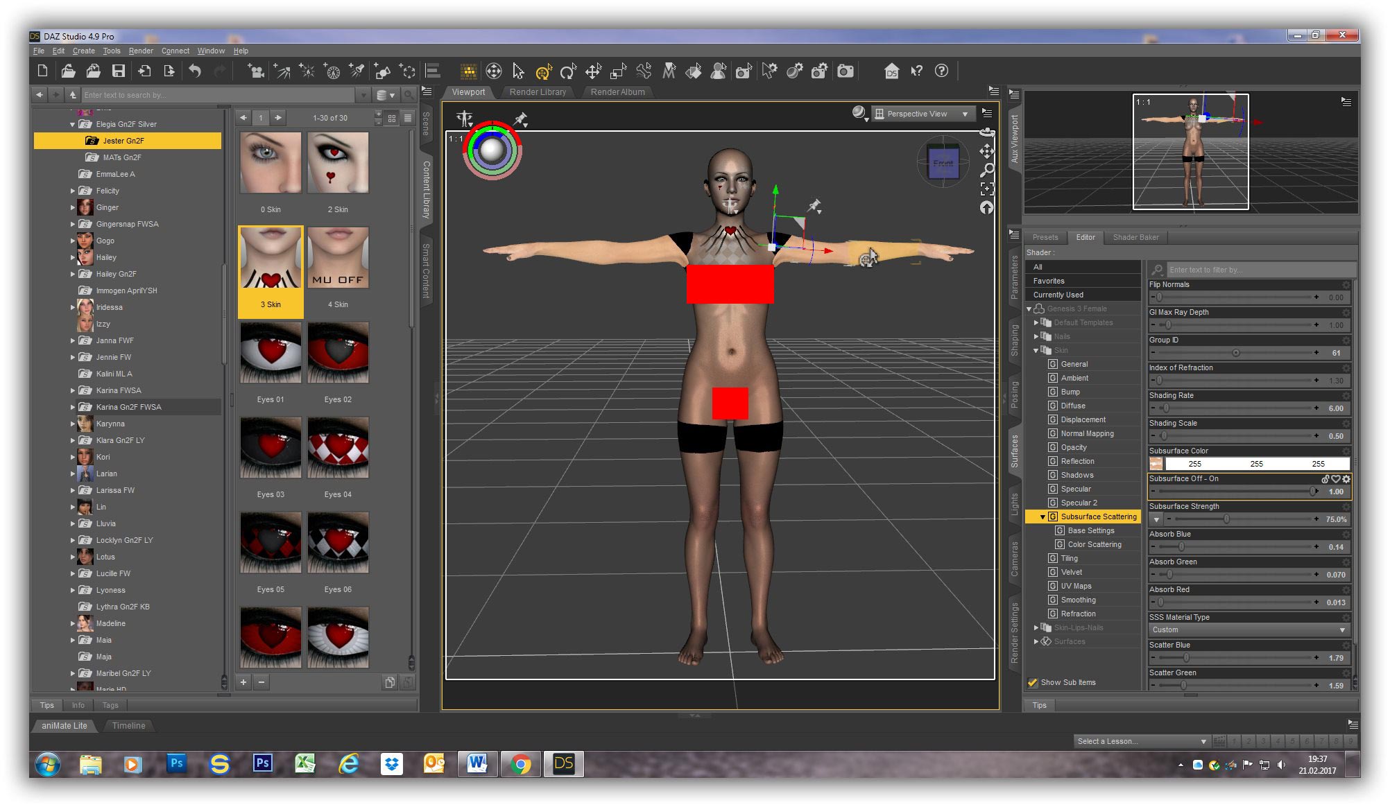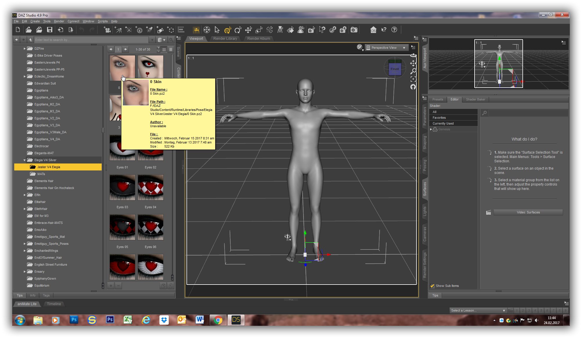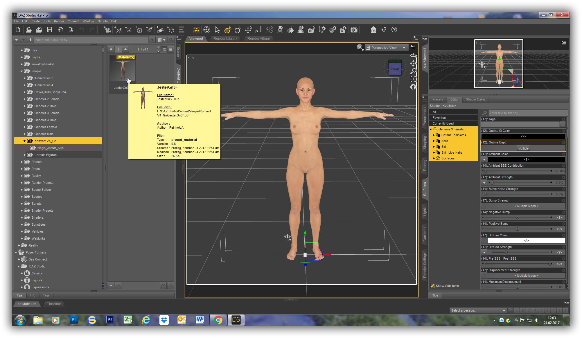 2) Ich lade die V4 Jester Skin aus dem Ordner: DAZ Studio,Content, Runtime, libraries, pose auf die Genesis Figur (siehe Konvert01.jpg)