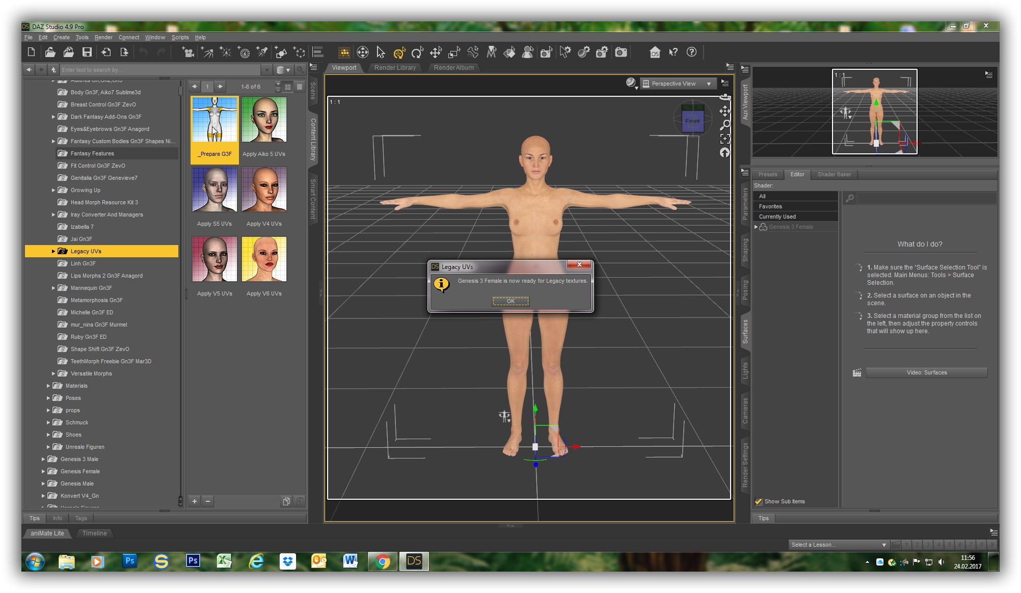 danke Dir für Deine Erklärungen, die Dateien der Skins liegen ja durch die Konvertierung von V4 zu Genesis 2 Female alle vor. Nur ich müsste diese Genesis 2 Female Skins jetzt irgendwie noch auf die Genesis 3 Female konvertieren und da weiß ich nicht, wie das funktioniert, da ich nicht weiß, wie das Rero Tool (welches ich extra dafür gekauft habe) funktioniert.Ich habe als erstes die Genesis 3 Female Figur aktiviert, dann auf den Button "prepare G3F" geklickt, dann wird eine neue G3 Figur mit den eingefügten Körperpartien generiert (auf dem Screen schwarz dargestellt) - und dann weiß ich leider nicht mehr weiter? Wenn ich dann auf die konvertierte Gn2F Skintextur klicke passiert nichts bzw. wird die Skin total verschoben dargestellt (siehe ebenfalls Screen).