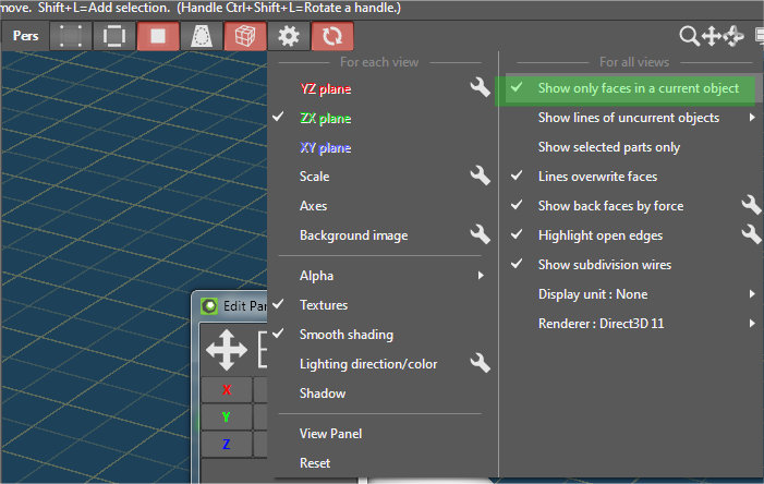 keine Ahnung was du genau meinst mit machen will . Mann muss schon je nachdem was man bearbeiten will selectieren . Das Objekt selbst , oder faces , edges und Points . Mann kann aber zb anderre Elemente oder andere Objekte beim bearbeiten ausblenden lassen