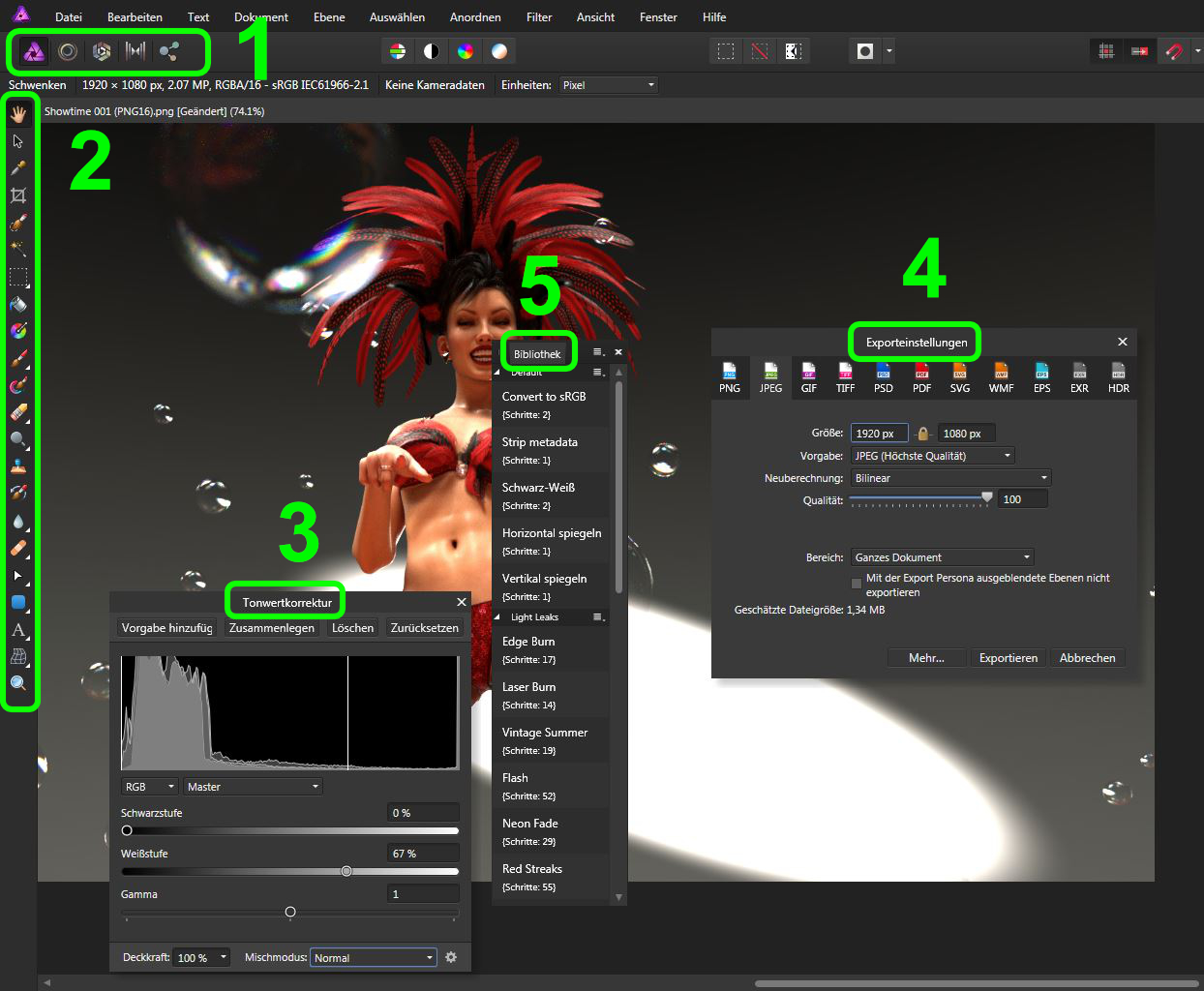 Affinity ist ein 2D Postworker, welcher neben den üblichen Dateien auch PSD, RAW, sowie 360 Grad Bilder und vor allem(!) OpenEXR Dateien (32bit HDR) bearbeiten kann.
