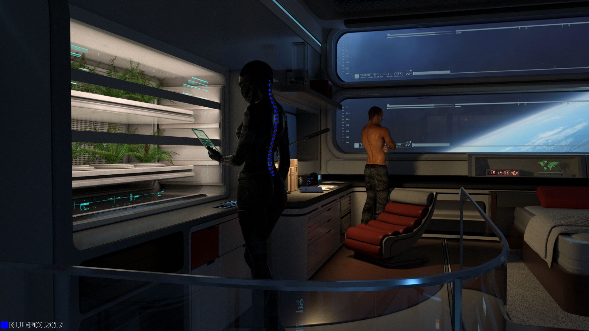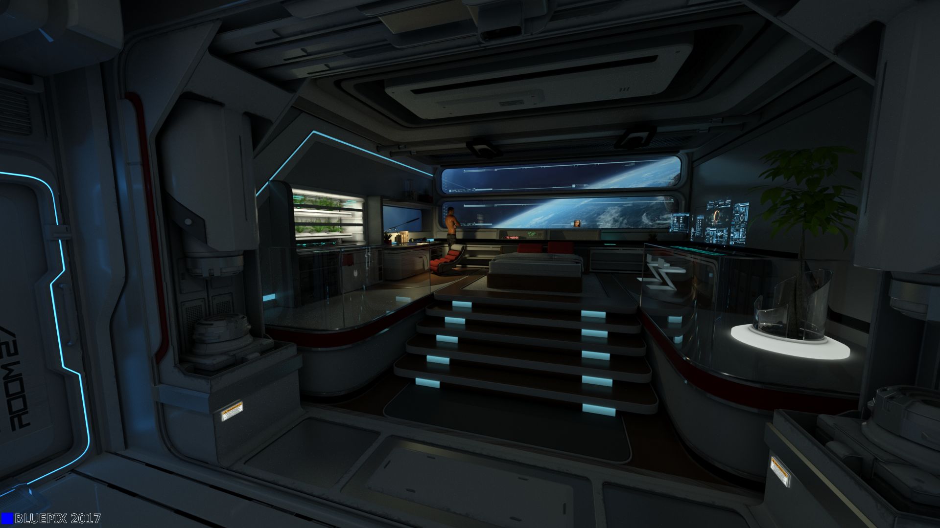 Die Gesamtausleuchtung kommt also (wie in vergleichbarer realen Situation) nur über etliche schwache Quellen (Schreibtischlampe, Monitore, Displays usw.) im Raum und durch die Sterne bzw. Planeten von außen zustande.