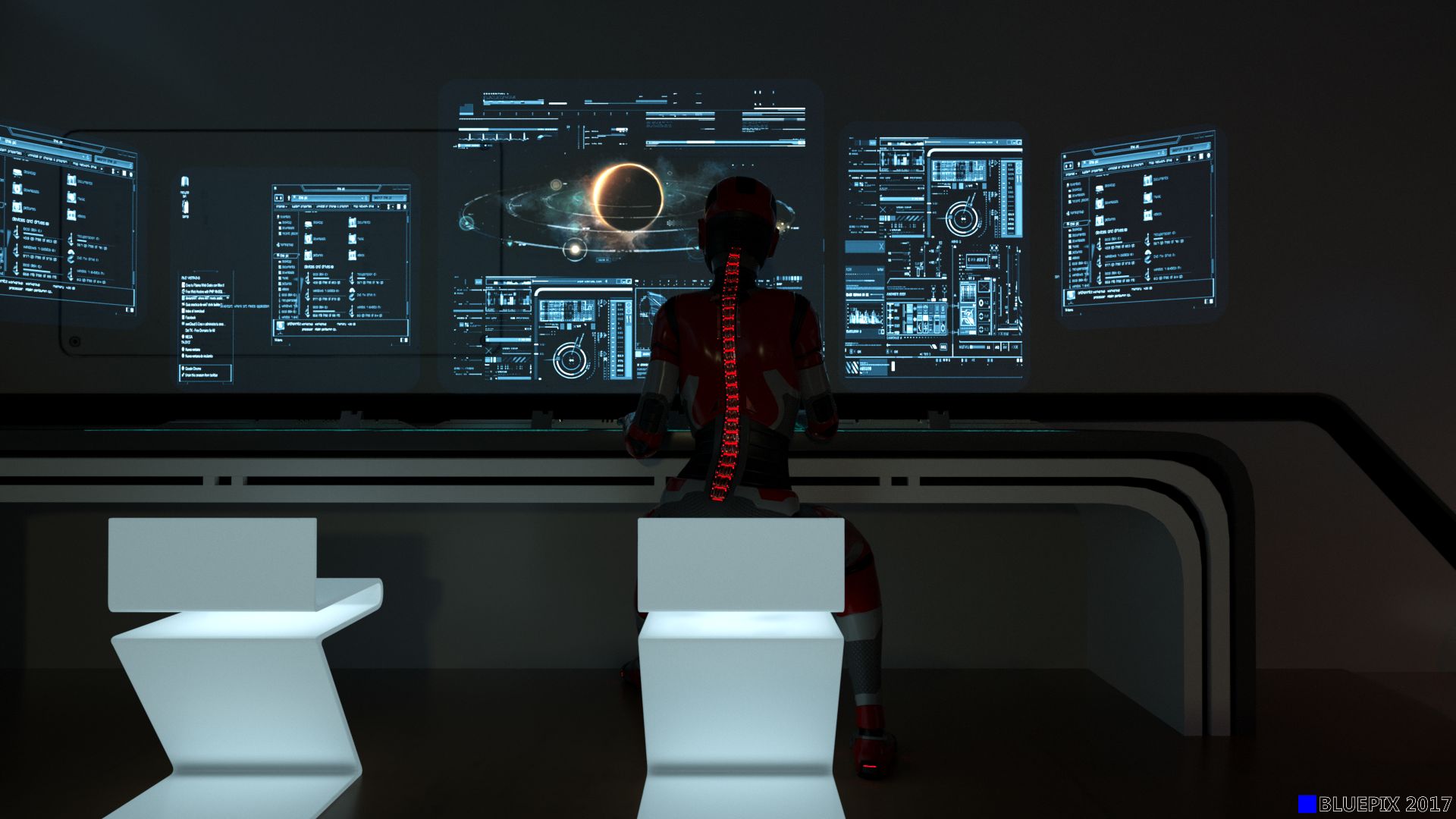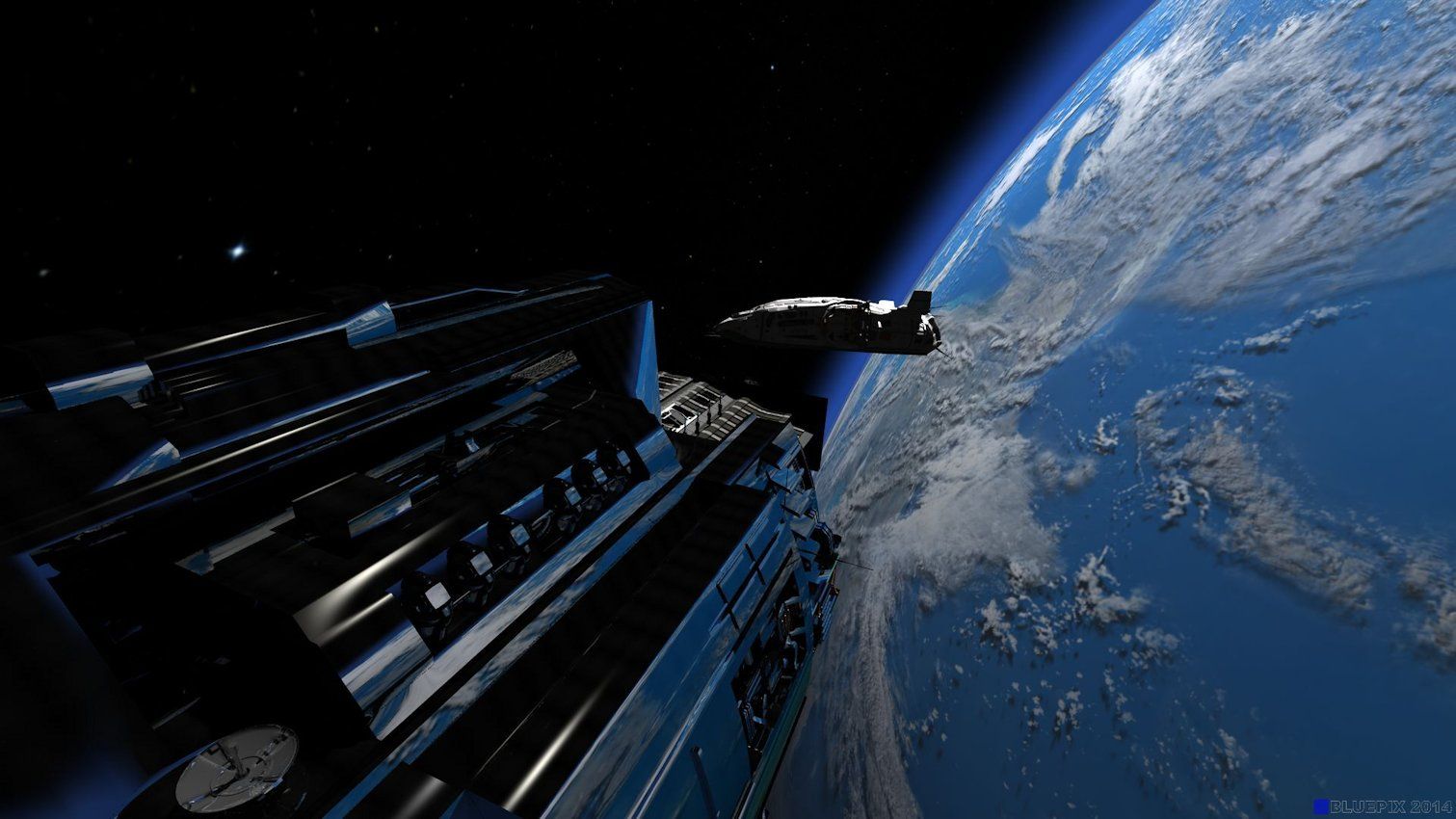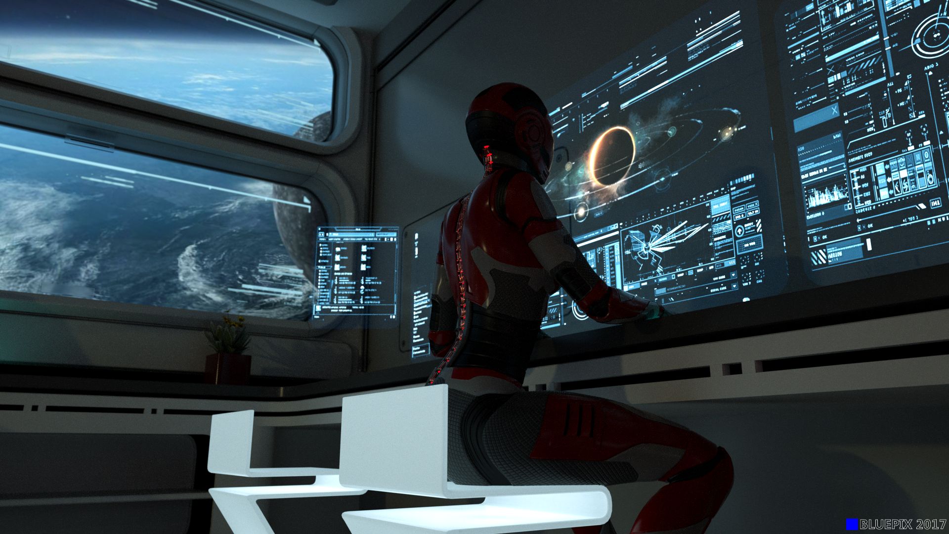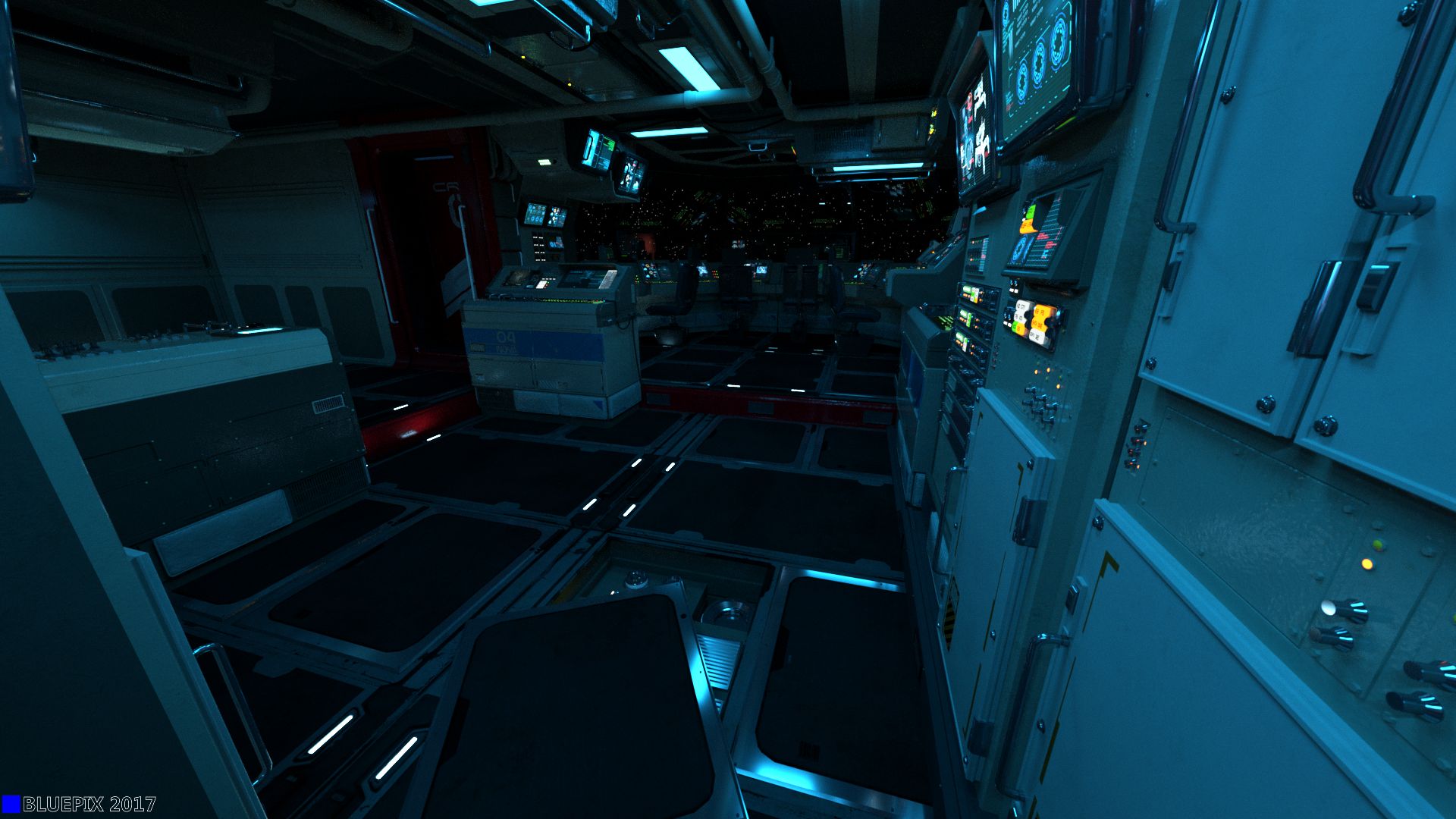 Die Gesamtausleuchtung kommt also (wie in vergleichbarer realen Situation) nur über etliche schwache Quellen (Schreibtischlampe, Monitore, Displays usw.) im Raum und durch die Sterne bzw. Planeten von außen zustande.
