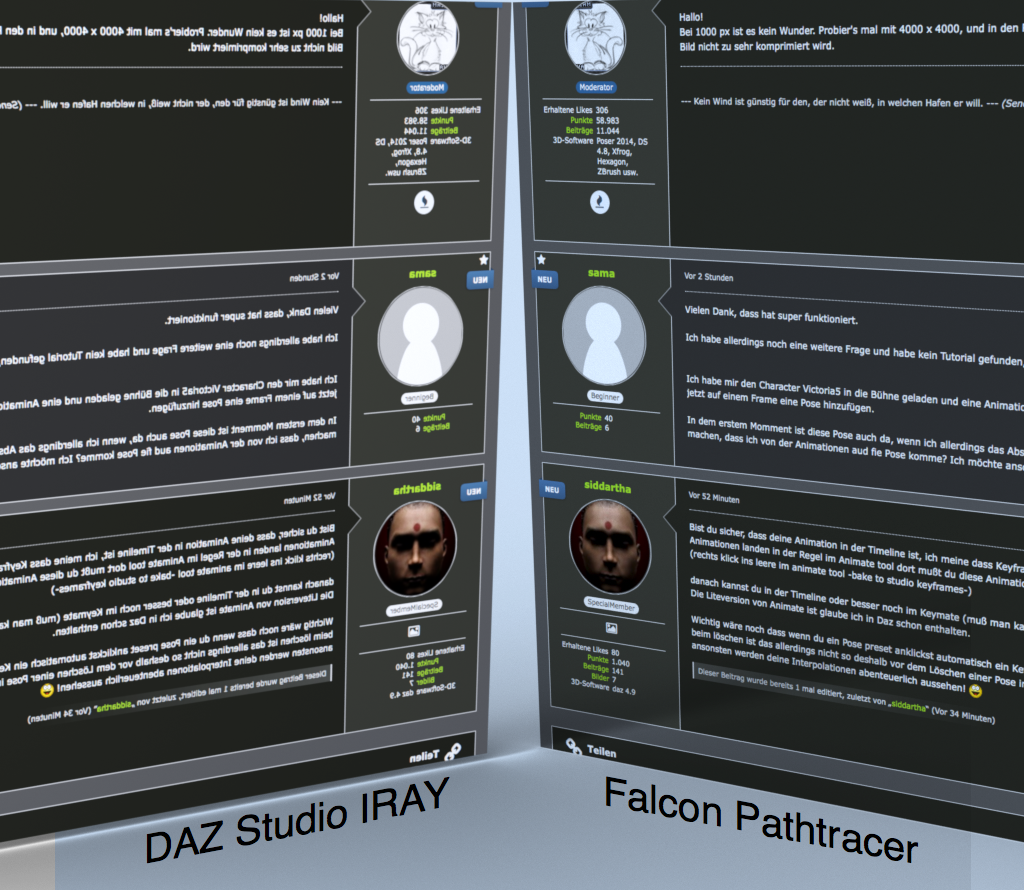 Hier habe ich einen 1K großen Screenshot auf eine Plane gemappt und links per default-Einstellungen in DS/Iray gerendert (25min - uff) und rechts mit einer ungefilterten Textur im Falcon Pathracer ca. 3min laufen lassen: Man sieht ziemlich deutlich den Weichspüler.