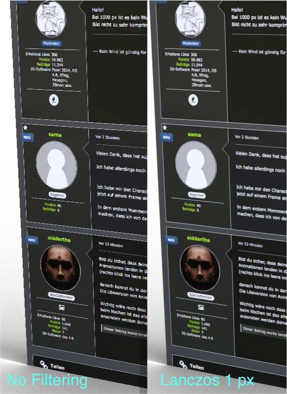 Hier habe ich einen 1K großen Screenshot auf eine Plane gemappt und links per default-Einstellungen in DS/Iray gerendert (25min - uff) und rechts mit einer ungefilterten Textur im Falcon Pathracer ca. 3min laufen lassen: Man sieht ziemlich deutlich den Weichspüler.