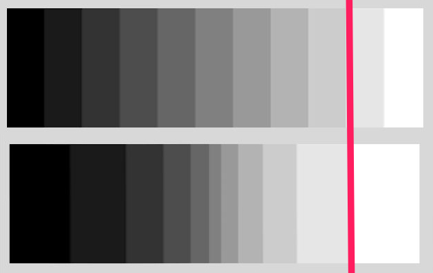 Der Grund ist unsere schlaue Mutter Natur. Sie stellt uns in dem für unser Überleben wichtigsten mittleren bis dunklen Helligkeitsbereich, weit mehr Stufen zur Verfügung als in den sehr hellen Bereichen.