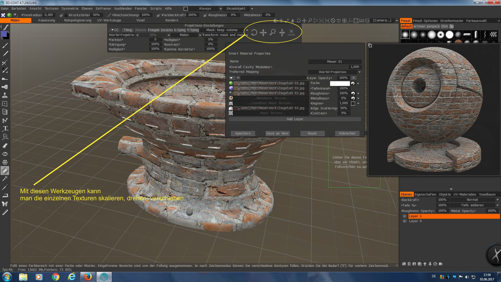 Frage 02: ich möchte eine Bildtextur zum aufmalen im Materialeditor passend transformieren. Geht das? Wenn ja, wie?