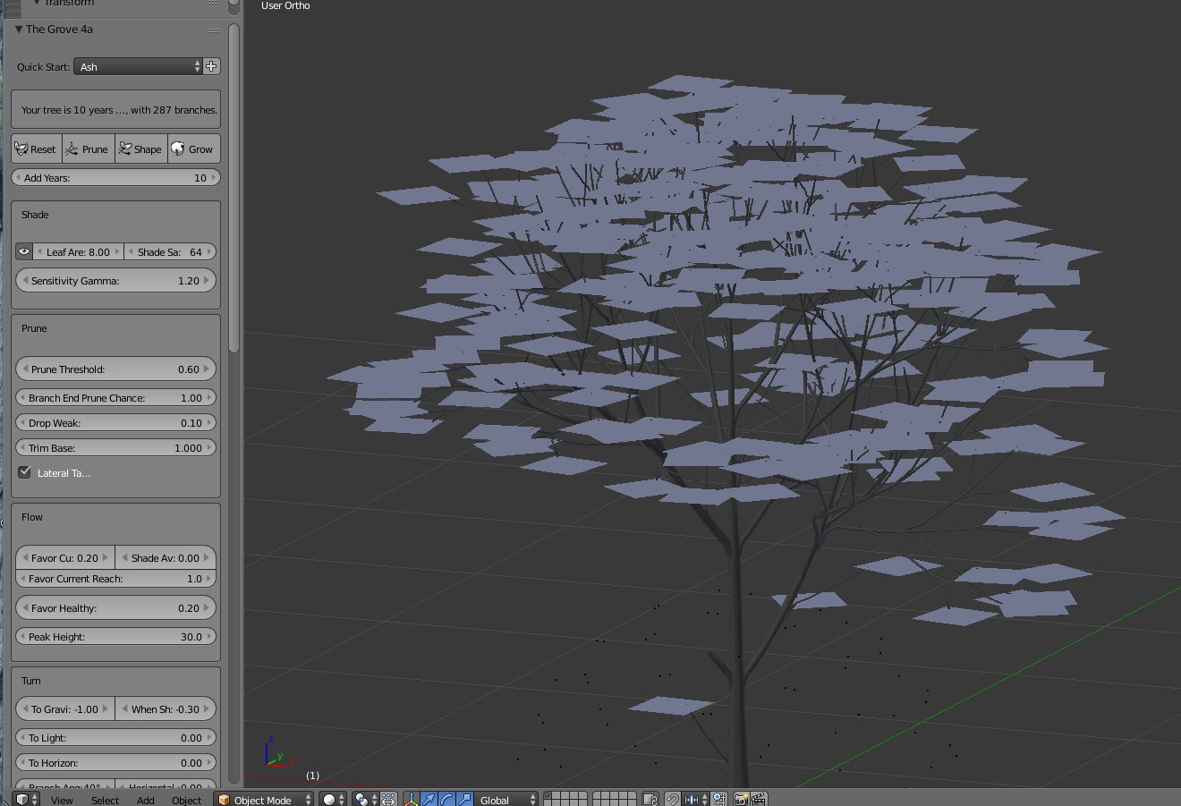 Die Blätter kommen als leere Planes daher, die ebenfalls auch im Blender-Render texturiert werden können. Links sieht man die vielen Einstellmöglichkeiten und da kann man noch ein ganzes Stück nach unten scrollen.Vielleicht liest Du Dir auch noch die Anwendungsbeschreibungen (unter LEARN zu finden) GROW, BEND, ........BUILD auf der The-Grove-Seite durch. Unter BUILD steht auch etwas zum Export der Bäume in andere Applicationen.