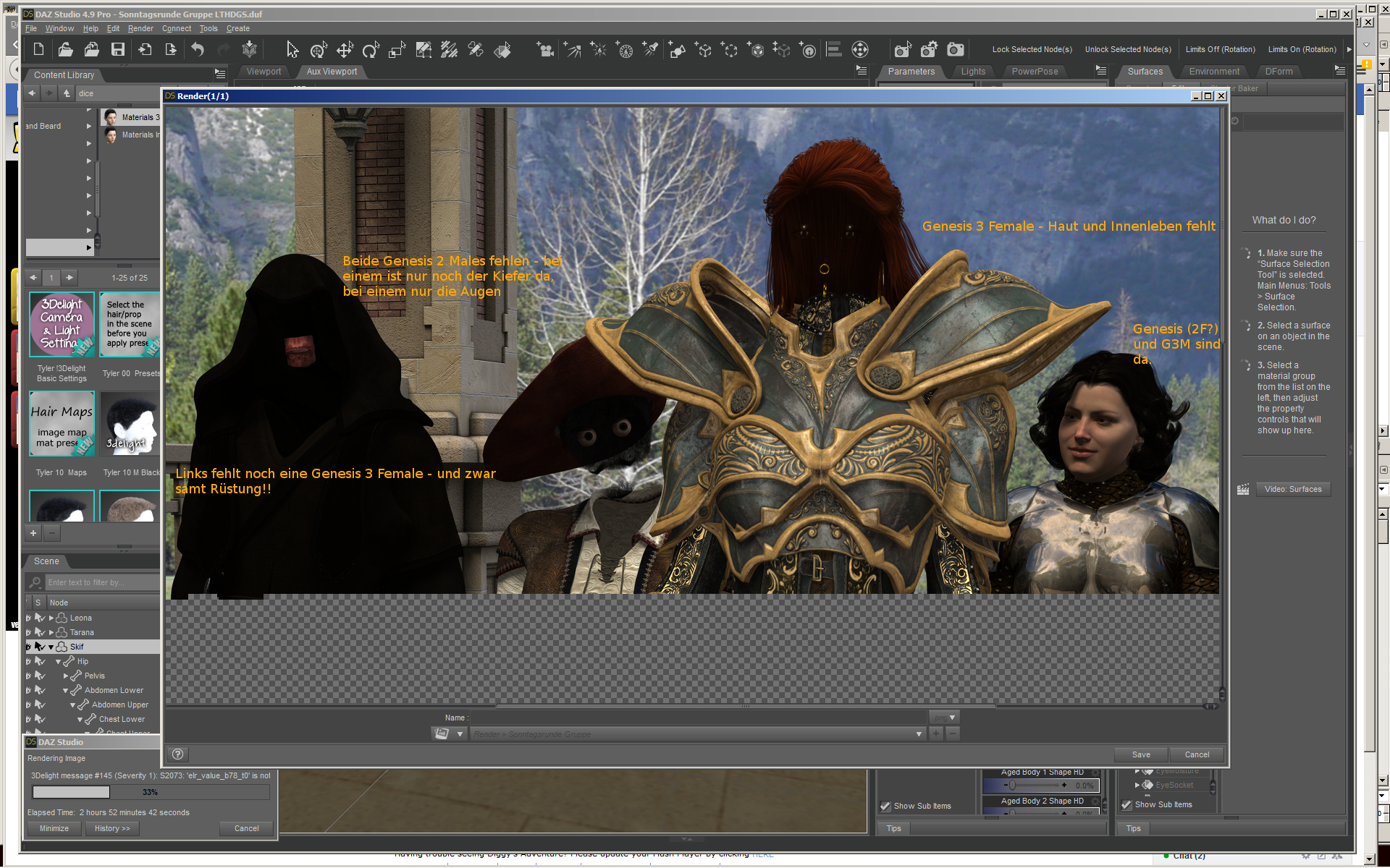 Jetzt habe ich gerendert (alles 3DL mit passenden Shadern, darauf habe ich geachtet), und auf einmal sind die Leute weg! Eine G3F fehlt INKLUSIVE ihrer Rüstung, bei allen anderen fehlen die Haut-Texturen und hinterlassen nur Löcher - als ob ich alles auf Fantom gestellt hätte (was ich nicht habe).