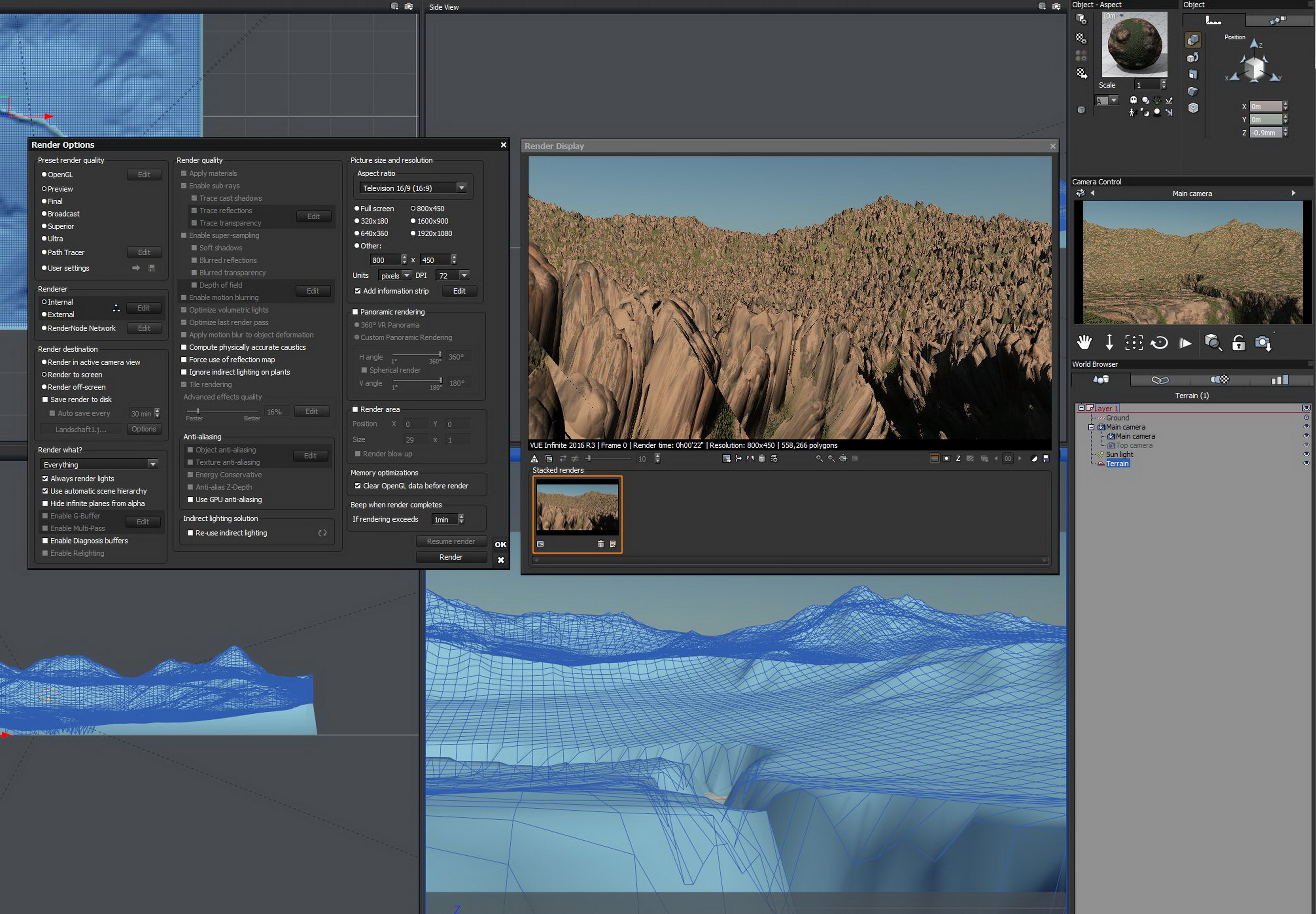 In der Vorschau und im kleinen Vorschau-Render ist die Landschaft, wie gewünscht, mit kleiner Schlucht.
