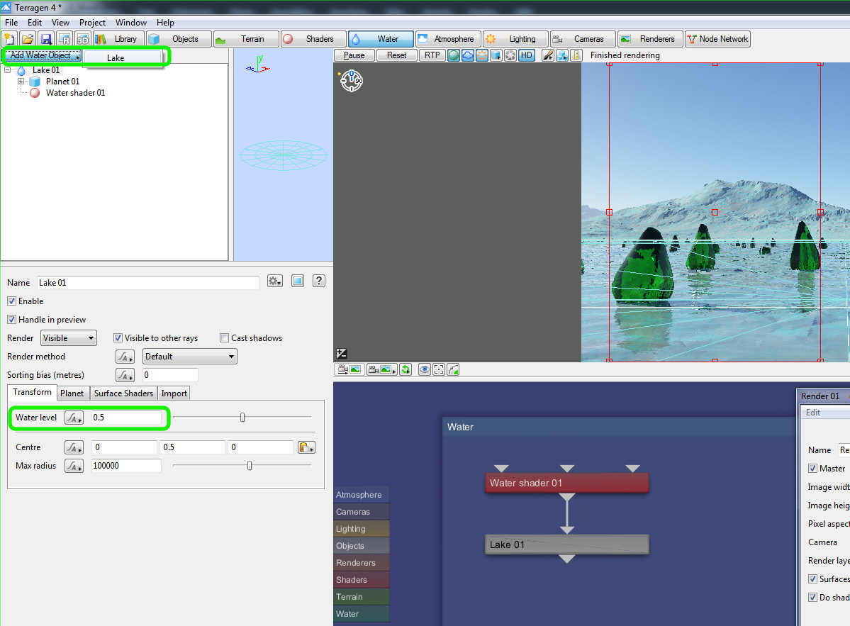 1. bei parallele Bearbeitung (Abstimmung) mehrer Objekte, z.B. Atmosphäre/Wolken/Sonne oder Terrain/Wasser/Objekte und Ähnlichem, arbeite ich immer über offen gehaltene Node Windows.