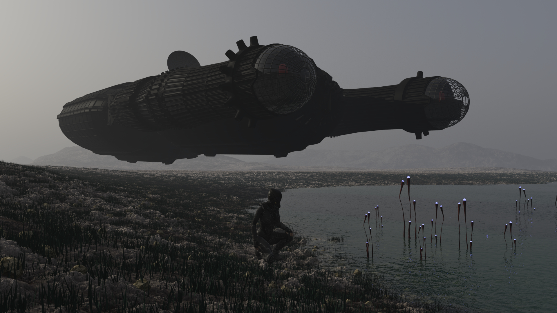 Test mit "gemalten" Populationen (Steine/ Gras/ Exo Gemüse), einer Lichtemission und gezielter "Verdüsterung" der Gesamtszene a la Alien Teil 1.