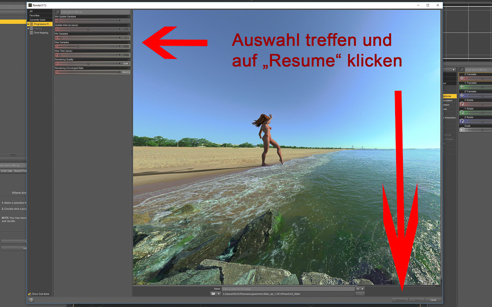 Hi, is there a way to continue a render after it is "ready"? For example: i rendered an image in Iray. After 6 hours Iray is ready - but not the image. Now i have to restart and do the render for > 6 hours FROM THE BEGINNING ON!!! I added "0" to the time and increased the max samples, but this all does not help. Daz breaks before the render looks good. How can i continue a "ready" render at a special render-point that I WANT (not DAZ wants) !!!